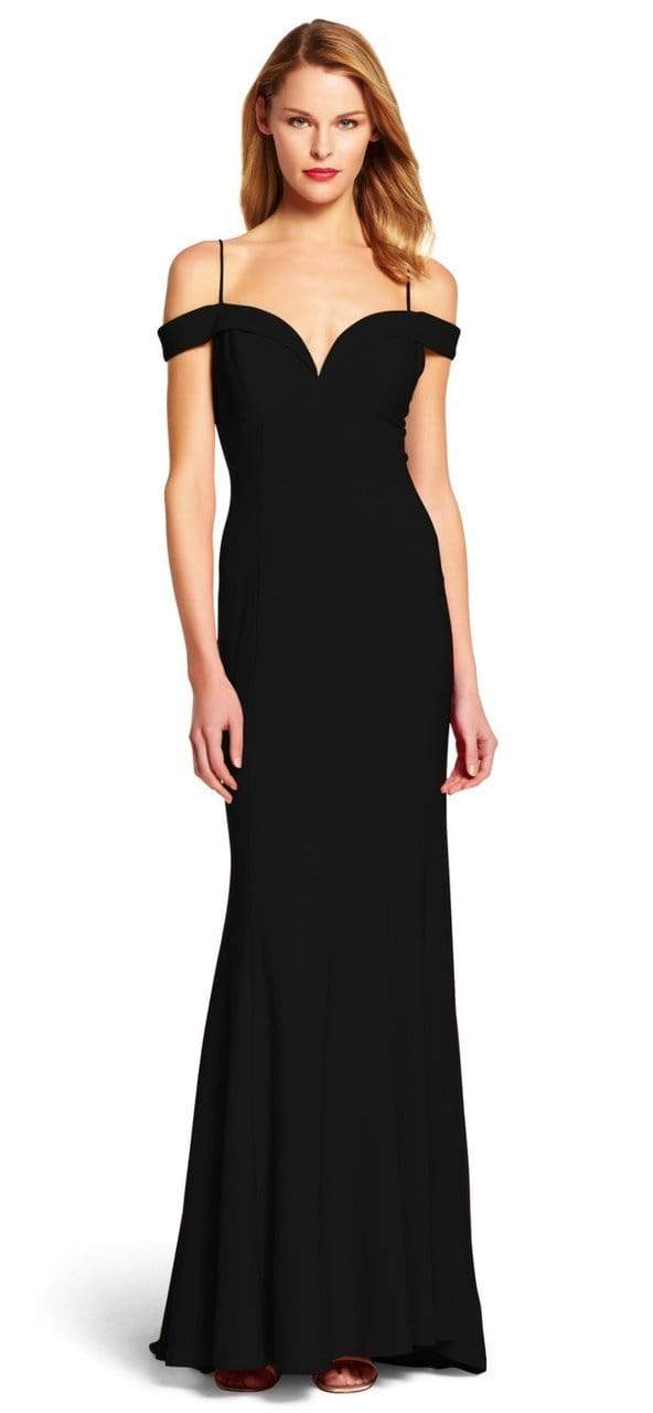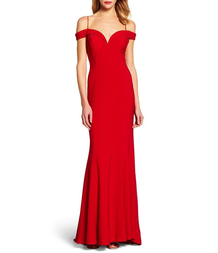 Be a woman of style and beauty in this classy Adrianna Papell 191916940 evening dress. This lovely ensemble features a fitted bodice topped with an off-shoulder neckline supported by spaghetti straps that leads to the mid-open straight back. The curve hugging silhouette cascades to the floor and finishes to a beautiful mini train. A back center zipper closure secures this style. This Adrianna Papell design is a sure winner creation!