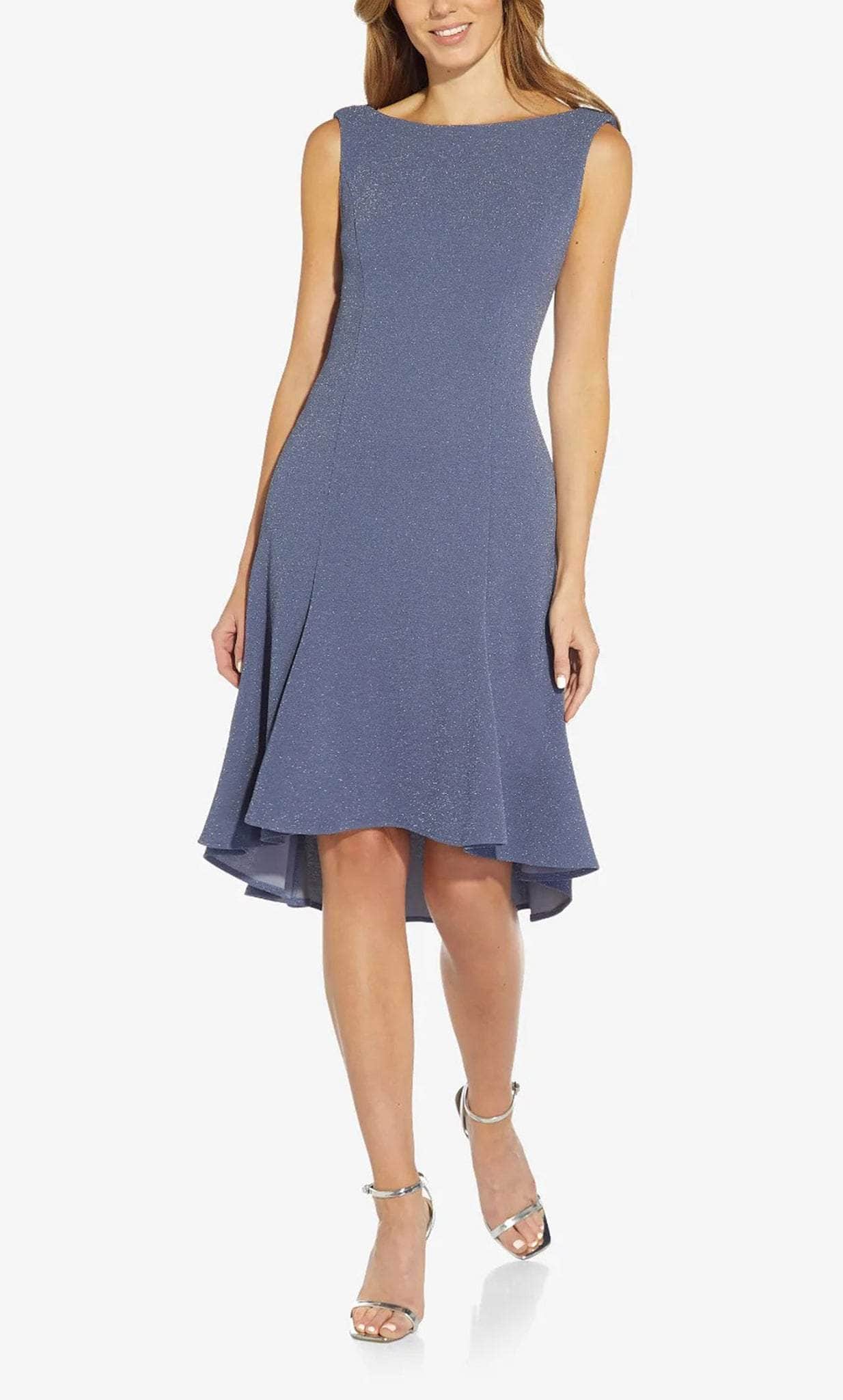 Sparkle like the stars on the midnight sky in this figure flattering Adrianna Papell AP1D104418 creation. Contoured with tailoring details that showcase the female silhouette, this beauty charms with a bateau neckline on a sleeveless bodice. Graced at the back with a draping low cowl detail, this piece reveals a perfectly sculpted waist and hips. The skirt softly flares into a high low design with a knee length hemline. Stand out among the fashion stars as you show off class in this Adrianna Papell masterpiece. Model is wearing the Steel Blue color.