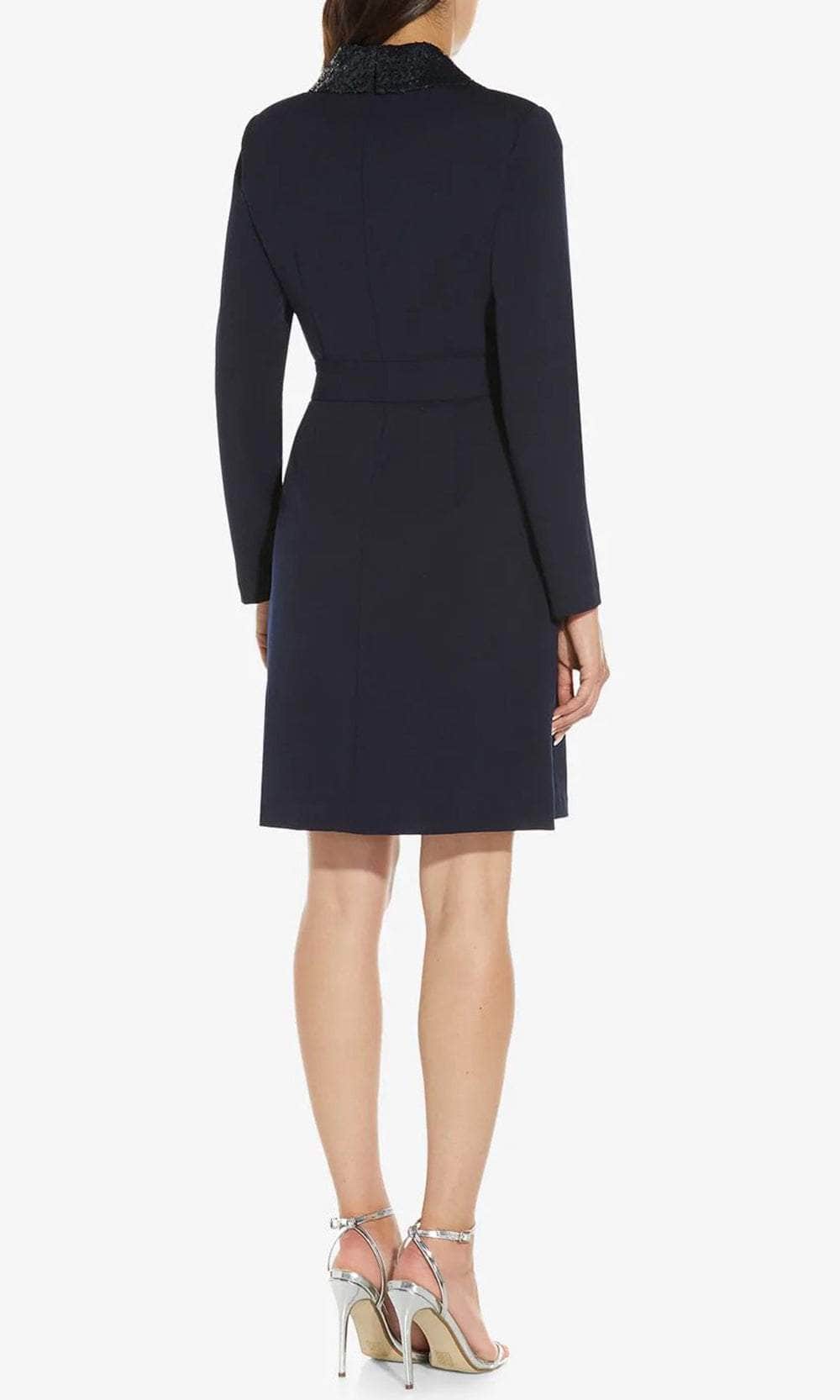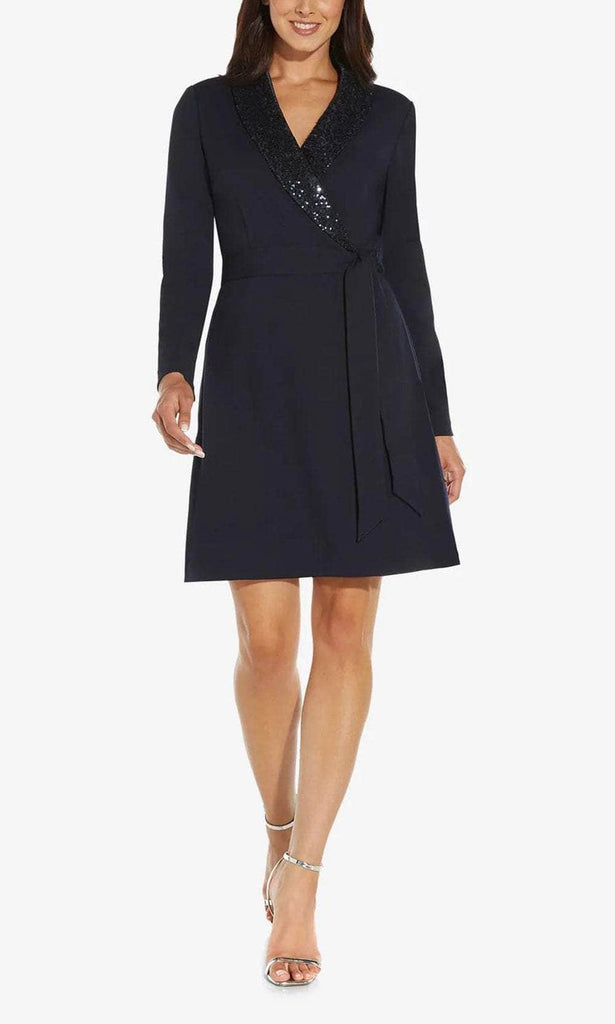 Exude a stylish flair that is to die for in this chic Adrianna Papell AP1D104563 creation. Festooned with sequins on the shawl lapel of the bodice, this piece parades a tuxedo tailored silhouette. Styled with a wrap style bodice and long sleeves, this ensemble is dominated with a v-neckline and a sash tied waist. Perfectly crafted from a structed crepe form, the skirt flares into an A-line silhouette with a hem just above the knees. Shimmer all night long with a fashionable flair in this gorgeously crafted Adrianna Papell masterpiece. Model is wearing the Black color.