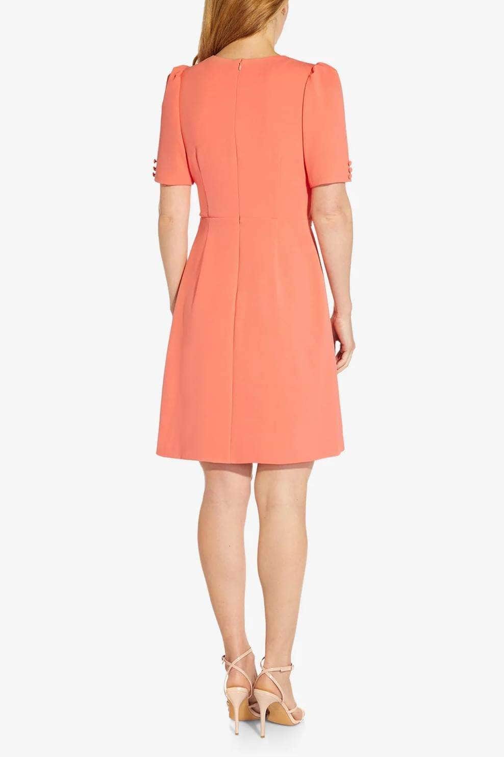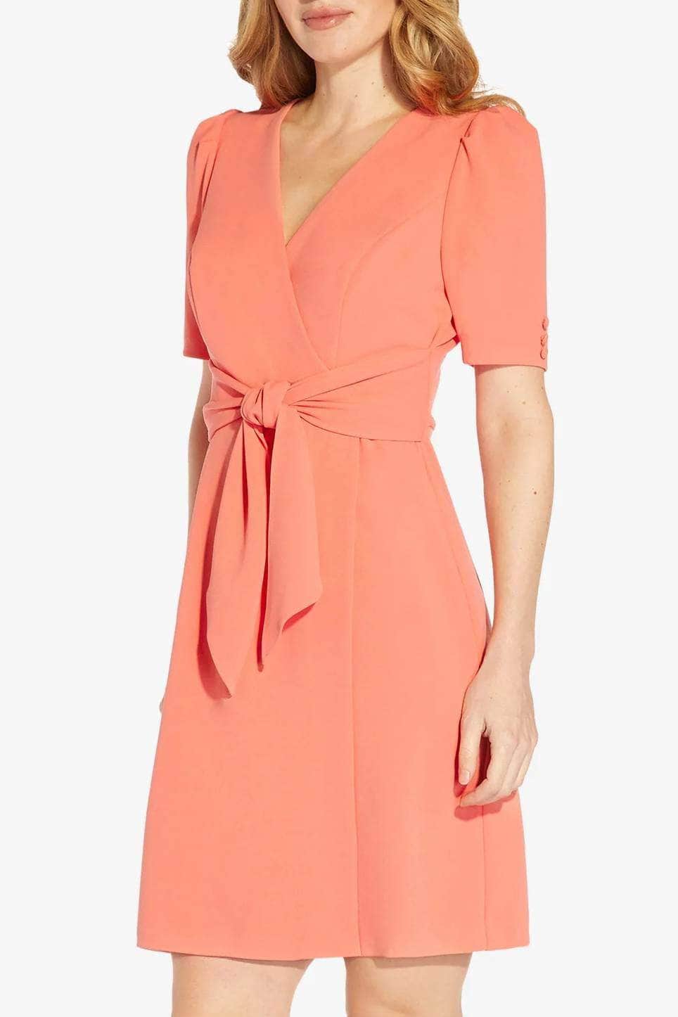 Display a stunning sense of style with this Adrianna Papell AP1D104632. Beautifully crafted with clean seams and tailored from a crepe fabric, this dress flaunts a V-neckline and a fitted bodice framed with short sleeves. Buttons are accented in the sleeves to make this more classy. A front tie cinched the bodice while the skirt parades a sheath silhouette. Show off your classy style when you wear this glamorous Adrianna Papell AP1D104632 creation. Model is wearing Peach Blossom color.