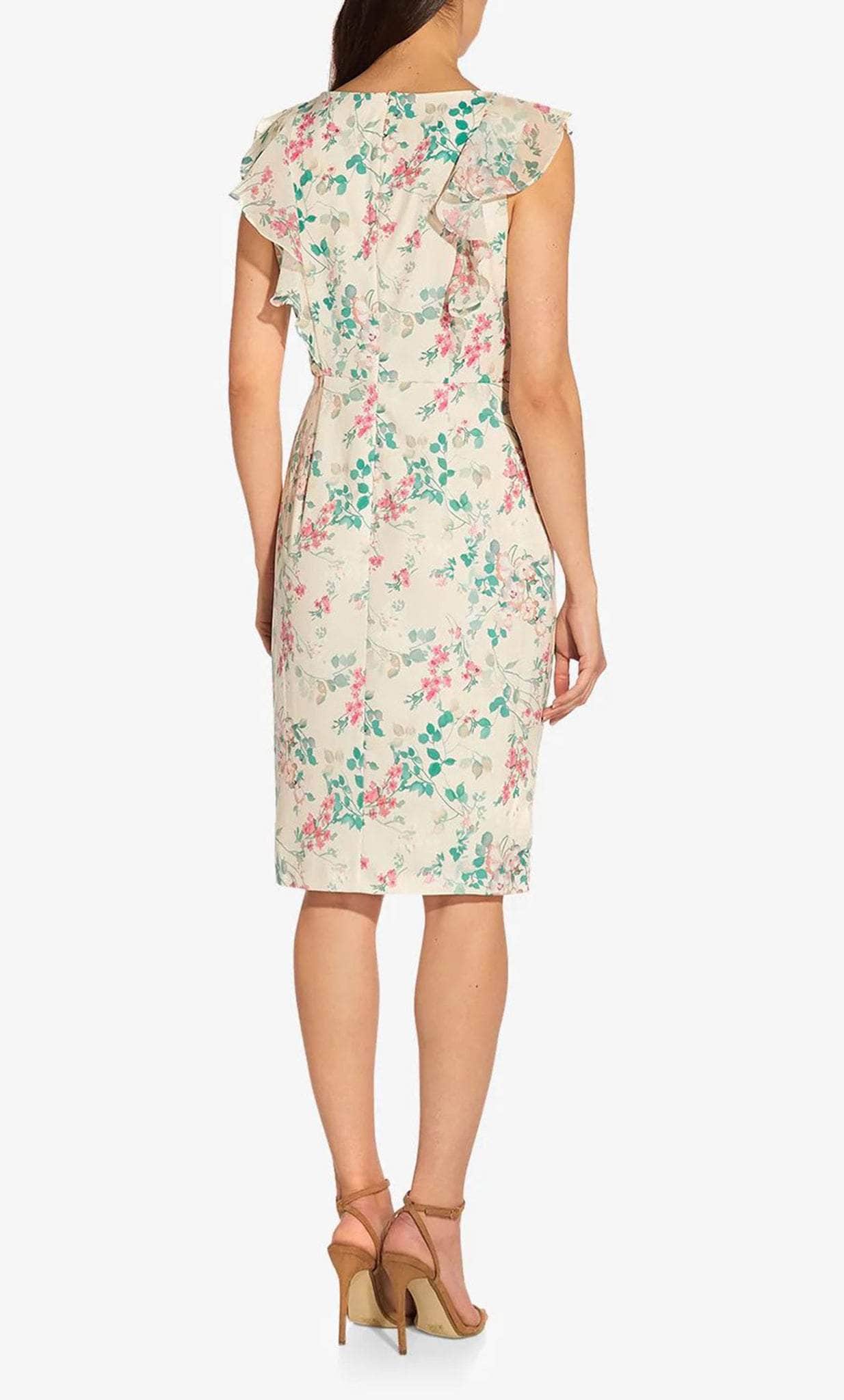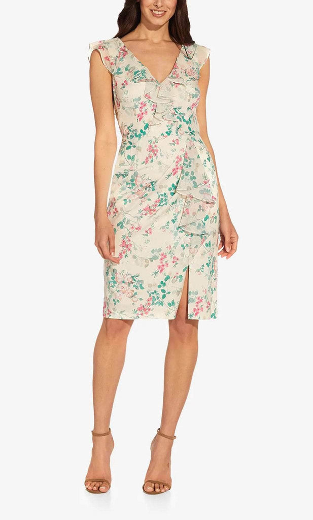 Standout with style and flawless fit in this Adrianna Papell AP1D104738. Staying simple and pretty in this dress that is perfect for any casual event or this can be your go-to dress. Featuring a sleeveless, ruffled detailed front and is crowned with a V-neckline on a natural-waisted bodice. It has floral prints all over while serving that sheath silhouette. A side slit gives an elegant look to this piece. Look gorgeous in this timeless Adrianna Papell AP1D104738. Model is wearing Alabaster Multi color.