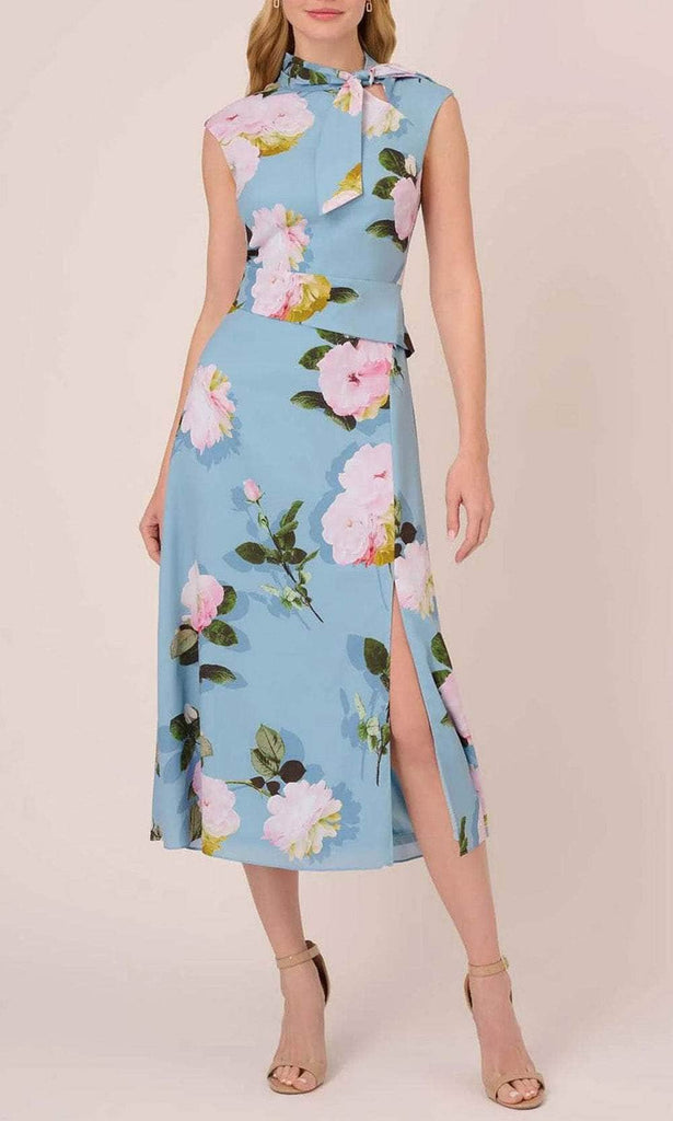 Draw attention with this gorgeous Immediate Apparel AP1D104960, a dress that effortlessly captures the essence of timeless charm. This sleeveless crepe dress boasts a high neck with a tie, adding a touch of sophistication. The back zipper closure ensures a seamless fit, while the tea-length skirt in a sheath silhouette exudes grace. An alluring side slit adds intrigue to your look, and the dress is fully lined for your comfort. Immediate Apparel AP1D104960 showcases your unique fashion. Model is wearing Blue Multi color.