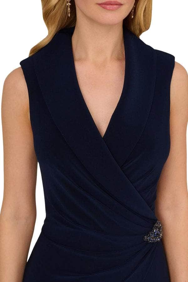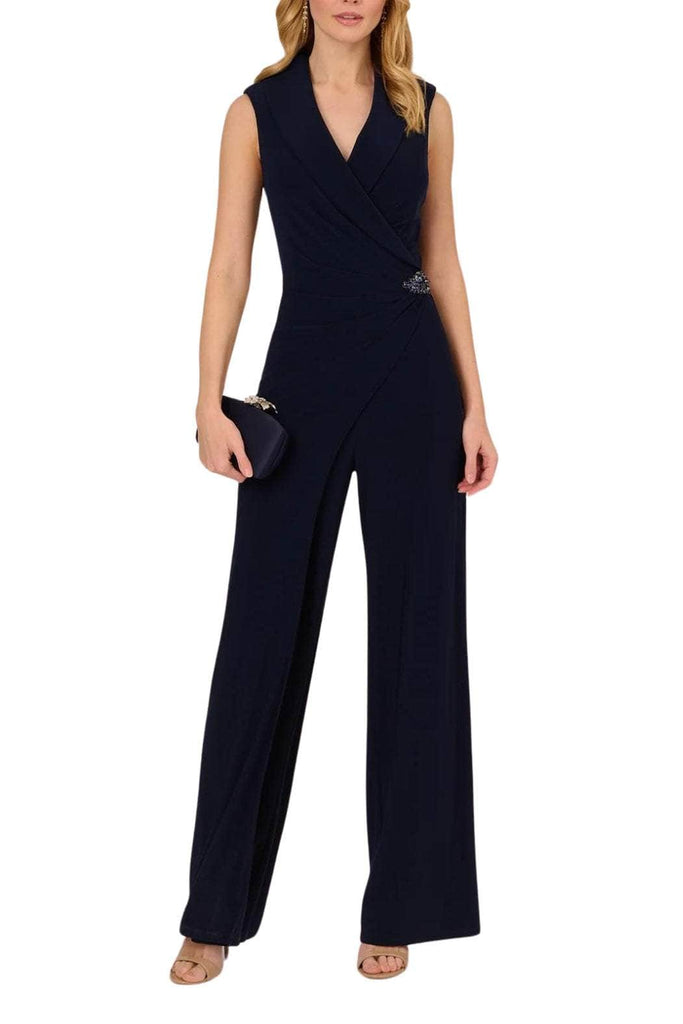 Make a statement in this amazing Adrianna Papell AP1D105272 creation. This sleeveless piece showcases a trendy collared v-neckline and a glamorous beaded brooch for a touch of sparkle. It is fashioned from jersey fabric, and designed in a jumpsuit silhouette to keep you comfortable and fashionable. In addition, it boasts a full back, and unique ruched wrap bodice that creates a flattering shape. The wide-leg pants finish the look, ensuring you stand out with style. This Adrianna Papell AP1D105272 masterpiece is a must-have, whether you are attending events or heading to the office. Model is wearing Midnight color.