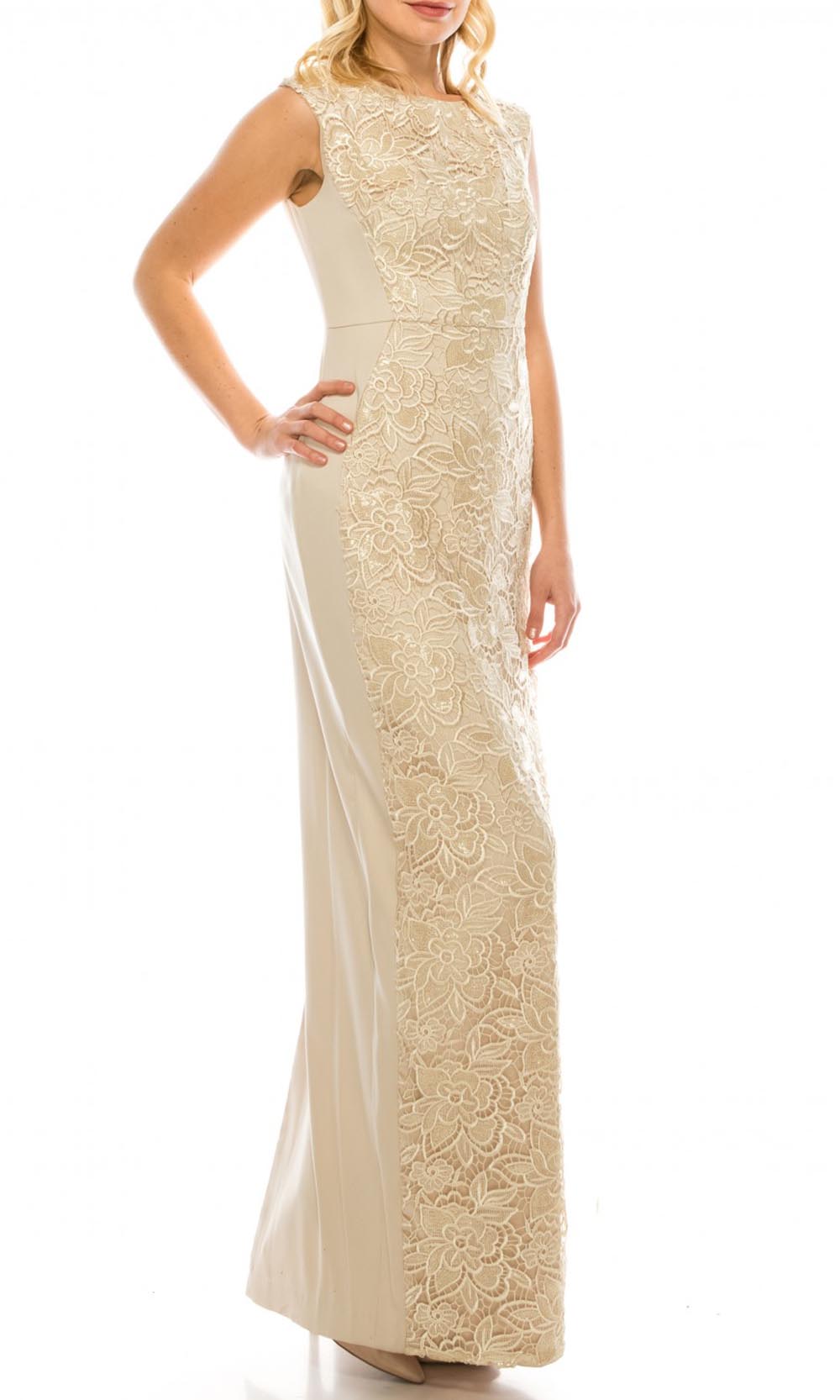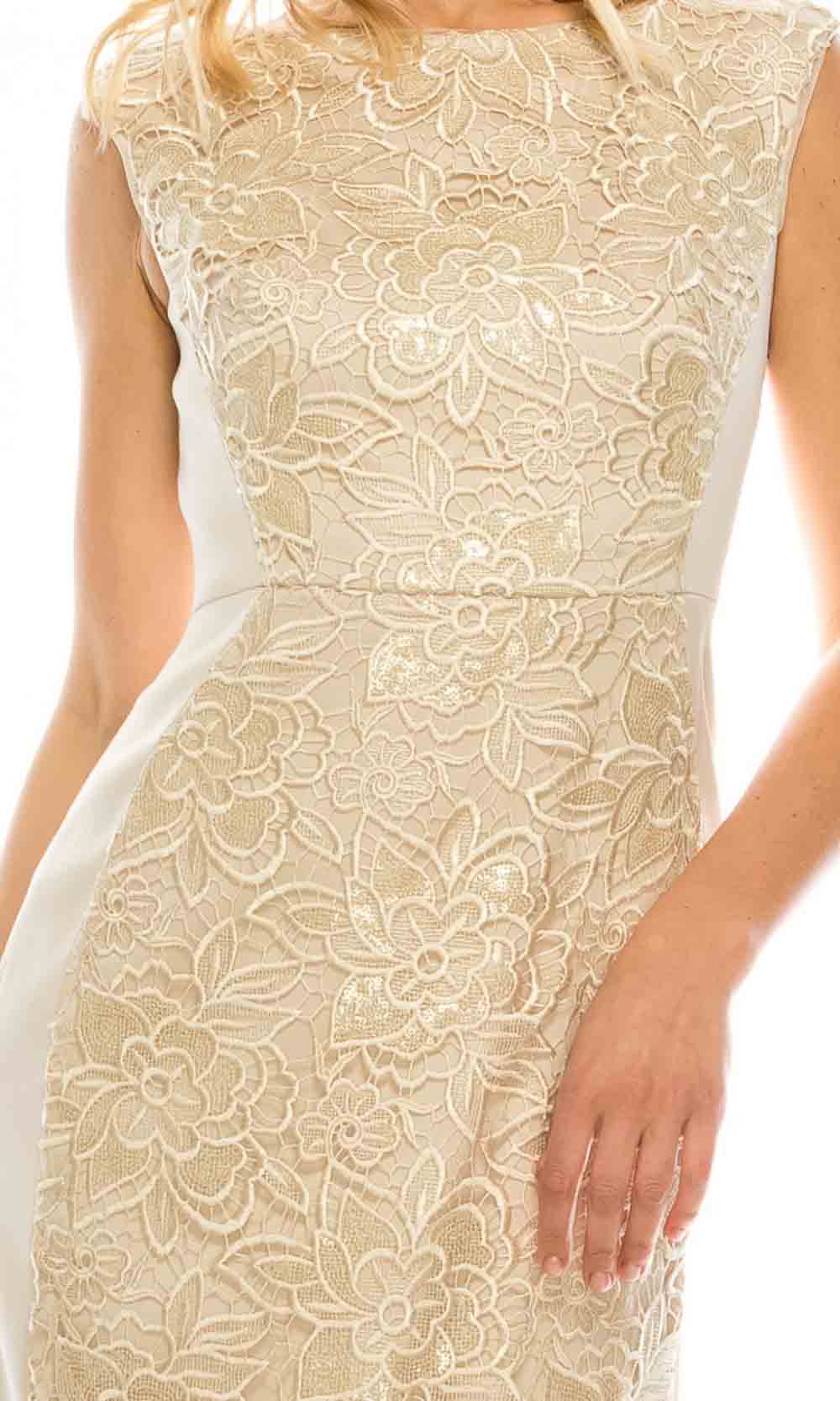 Show off your classy style when you wear this Adrianna Papell AP1E200762. This dress features a bateau neckline, cap sleeves and a column silhouette. The front is crafted in embroidered lace accented with sequins and the side and back smooth mikado. The dress highlights the high slit at the back. This Adrianna Papell is perfect for any formal evening.