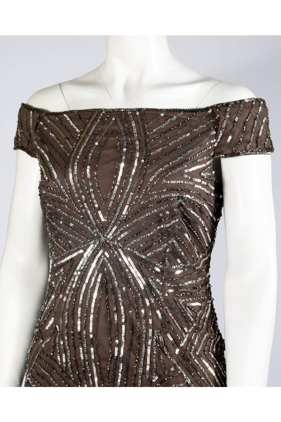| Details: | Beaded Mesh (100% Polyester) Lining (100% Polyester), Off-shoulder sleeves, Sequins, Fitted bodice, Sheath skirt, Back zipper. |