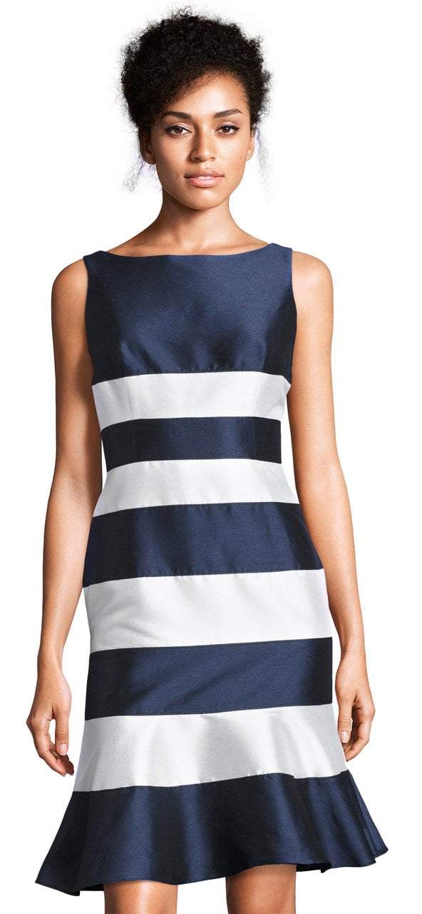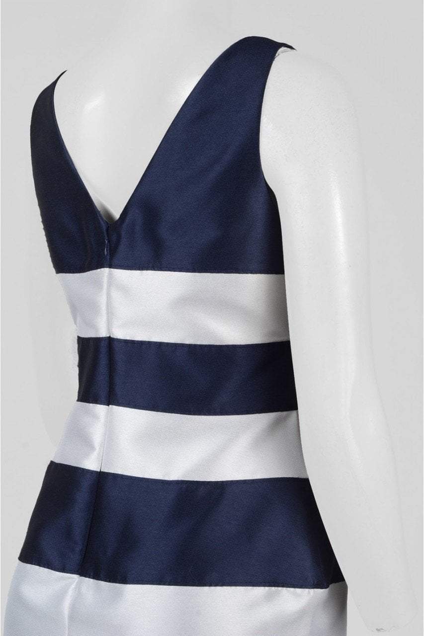 Be the lady of the night in this short ensemble by Adrianna Papell AP1E201573. This sleeveless dress brandishes in a bateau neckline with bodice patterned with bold stripes. The back has a V-shaped cut that connects to the back zipper. Finishing the look is a short sheath skirt with a slight flare at the hemline. This Adrianna Papell dress has a classic look that works for many special occasions.