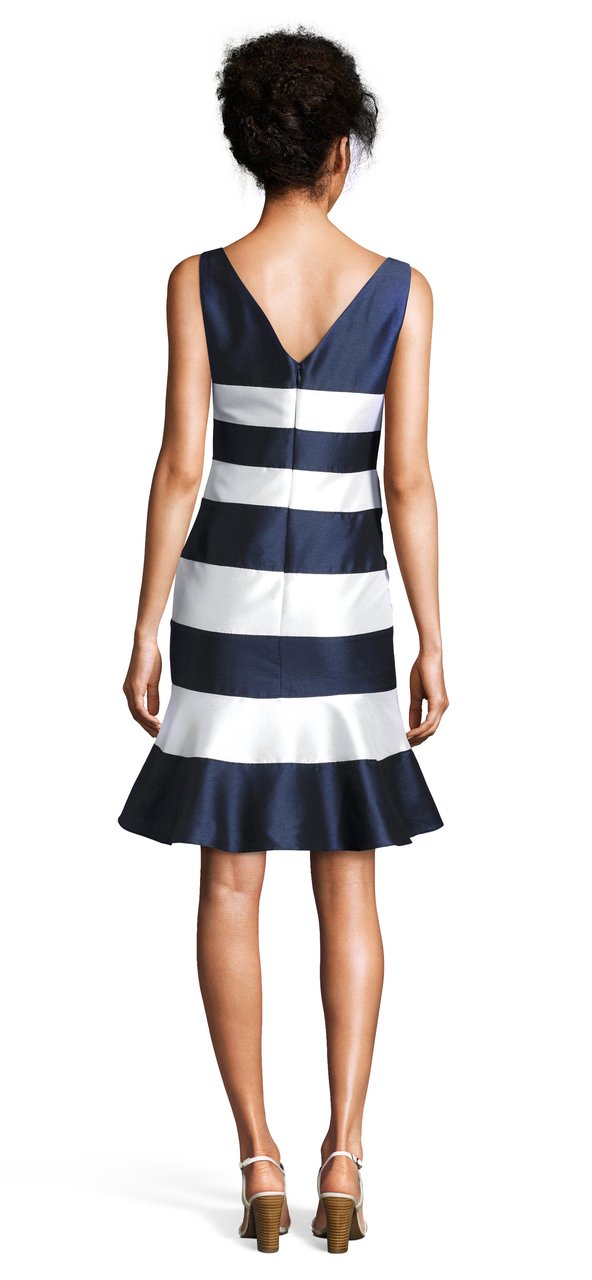 | Details: | Faille (100% Polyester) Lining (100% Acetate), V-back, Sleeveless, Back zipper, Stripe pattern, Bodycon, Sheath skirt |