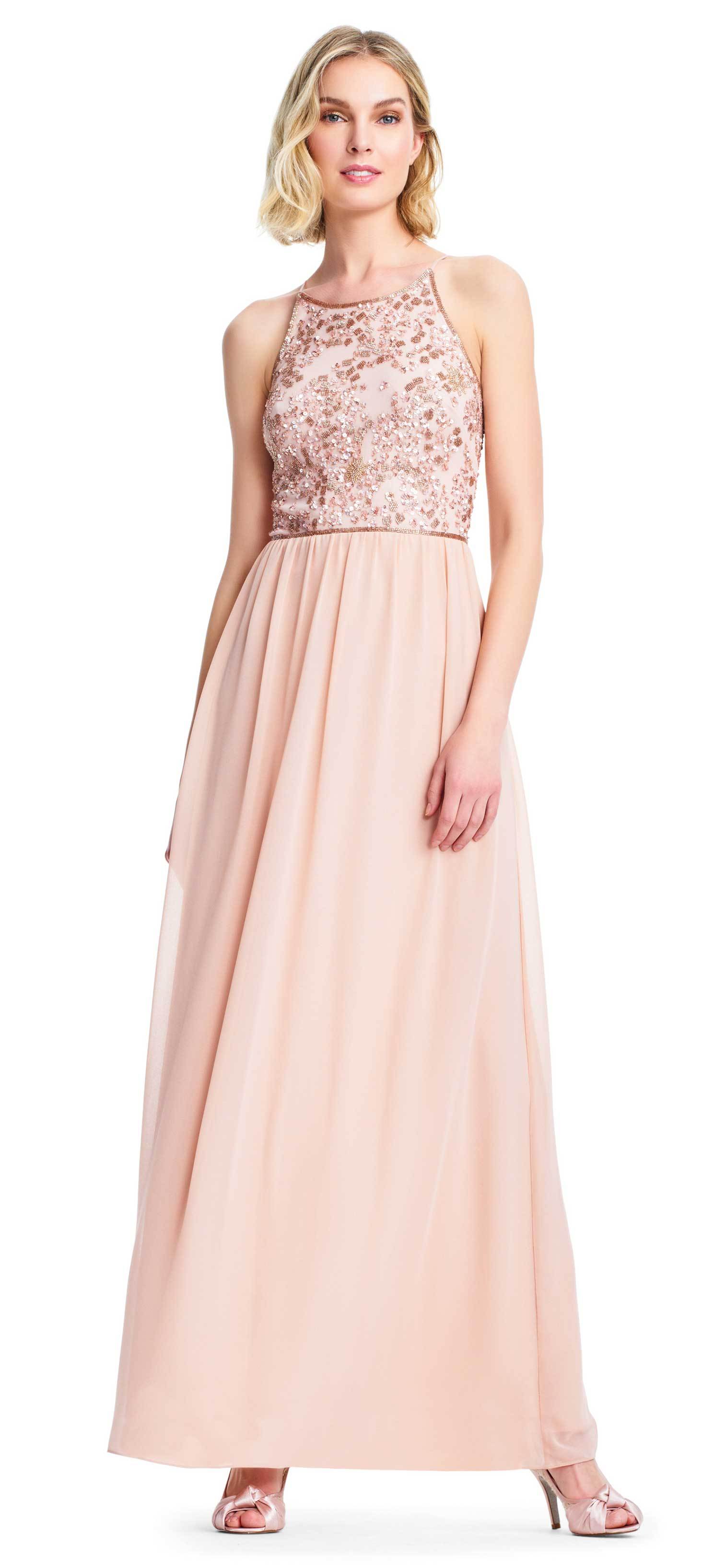 Get ready for everyone to stop and stare when you show up in this dress from Adrianna Papell AP1E203111. Presents in a sleeveless, halter neckline with fitted bodice ornate with beading and sequins. The back has a keyhole and zipper closure. The chiffon skirt opens in a flowy A-line silhouette and runs at full length hem. Flatter your finest assets as you enthrall the crowd in this Adrianna Papell creation.
