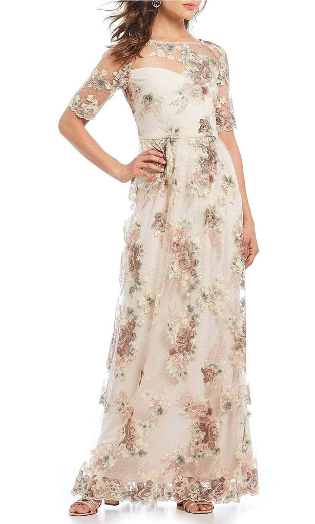 Make it your night worth reminiscing in this design from Adrianna Papell AP1E203576. Enchanting from top to hem, this ensemble has scalloped edging and ornamented with sweet floral embroidery on the mesh fabric. The illusion top is crowned by bateau neckline, short sleeves and partial sheer full back. Tailored in an A-line silhouette, the skirt is perfect to flatter any figure and it ends in sophisticated full length hemline. This Adrianna Papell AP1E203576 masterpiece is sure to be both comfy and fashionable. Model is wearing the Mink Multi color.