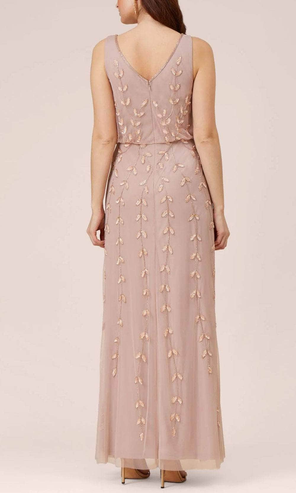 Walk in glamour and let all heads turn on you in this mesmerizing Adrianna Papell AP1E208913 creation. Beautifully overlaid with ethereal tulle while alluringly molding the feminine form, this piece parades a sleeveless bodice with a deep v-neckline and trimmed with beaded details. Designed with trailing embroidered foliage, this stunner also comes with a blouson bodice and v-open styled back with a concealed zipper closure. The sheath skirt traverses to the floor in a full length finish. Navigate the ballroom in style in this exceptional glamor in this Adrianna Papell AP1E208913 masterpiece. Model is wearing the Steel Rose color.
