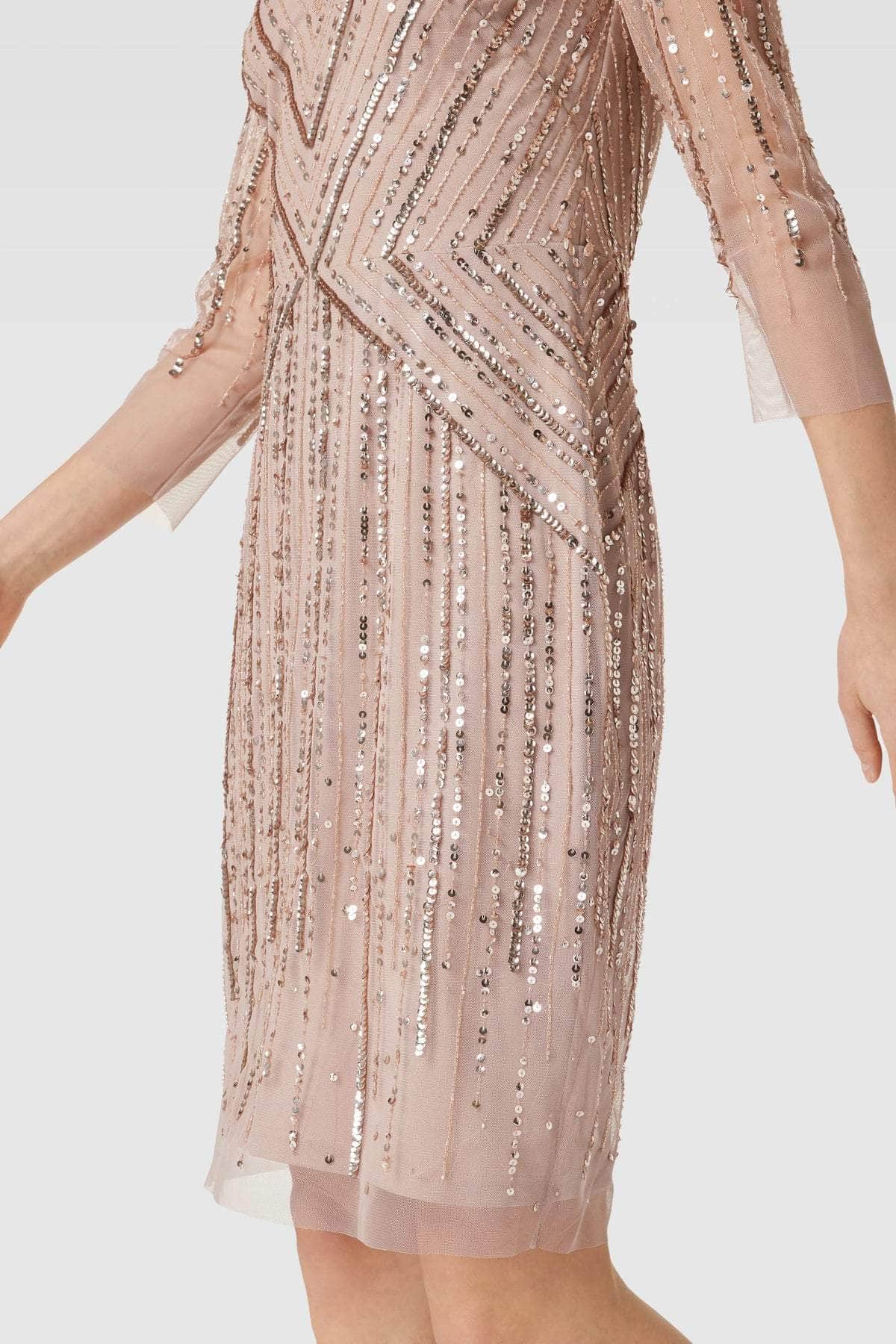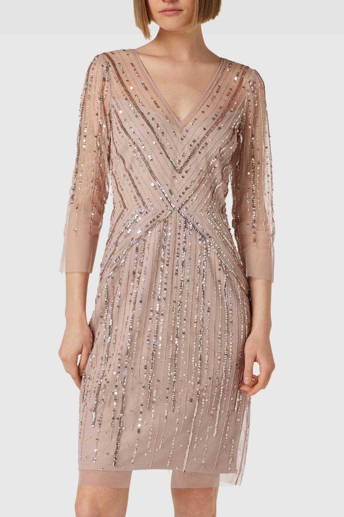 Illuminate any event with the Adrianna Papell AP1E209226 Dress, a stunning creation that combines glamour and sophistication. This dress is exquisitely embellished with sparkling sequins, ensuring a radiant shimmer that captures attention. The sheer quarter sleeves add an airy, ethereal touch, while the V-neckline enhances the neckline with elegant allure. The full back features a concealed zipper closure, providing a secure and seamless fit. The short-length sheath silhouette skirt offers a sleek, flattering look that moves gracefully. Perfect for special occasions, this Adrianna Papell dress guarantees you will shine with confidence and style. Model is wearing Steel Rose color.