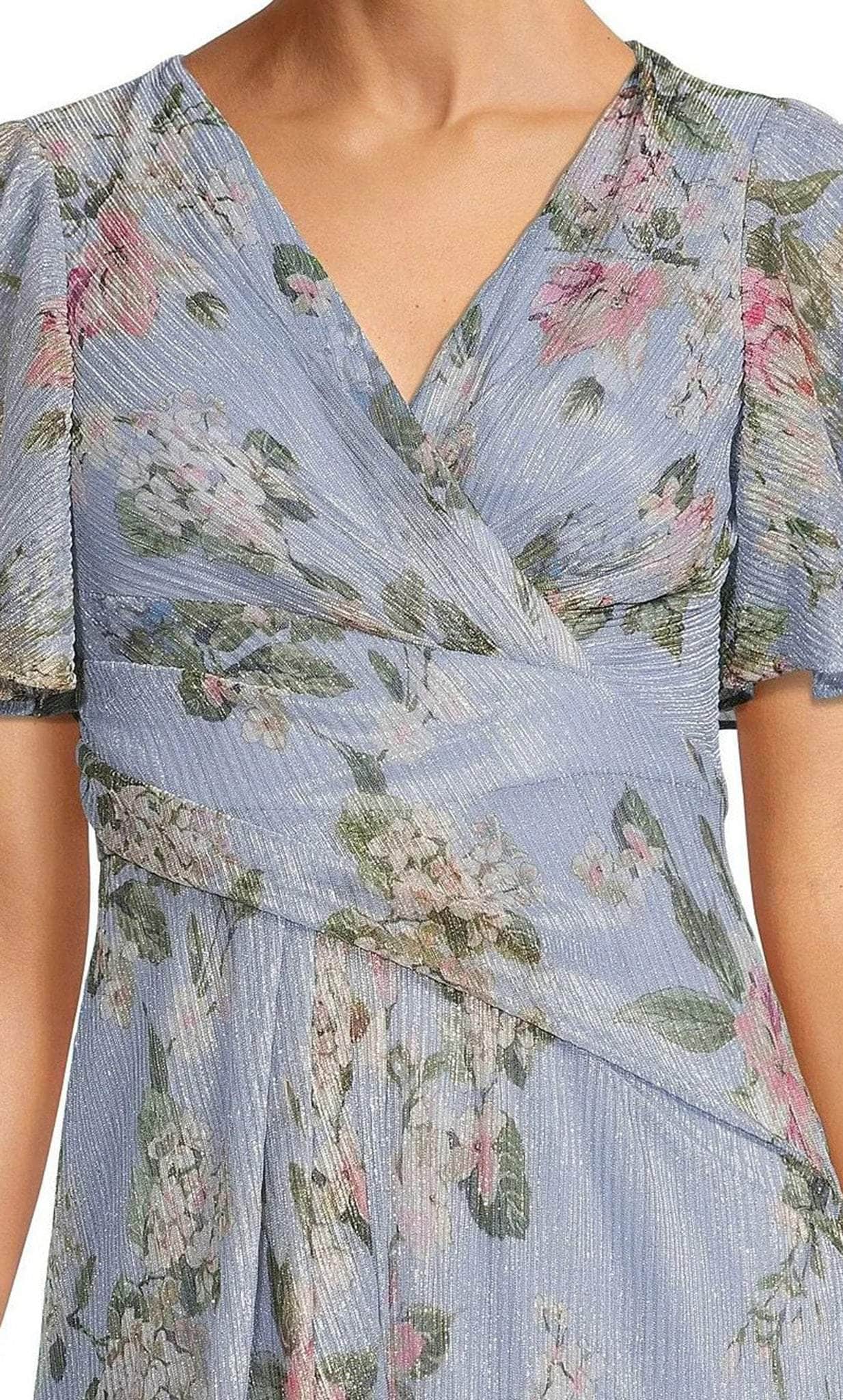 Capture the glamour as you walk on this stunningly gorgeous Adrianna Papell AP1E209735. The classic design, short sleeves, and pleated asymmetric folds create a timeless and elegant look that's both sophisticated and modern. The floral print adds a touch of femininity and romance, while the back zipper ensures a seamless finish. The short hem creates a classic and regal vibe, while the long length and natural V-neckline complements the timeless silhouette. Get ready to show off your glamorous side in Adrianna Papell AP1E209735! Model is wearing Dusty Blue Multi color.