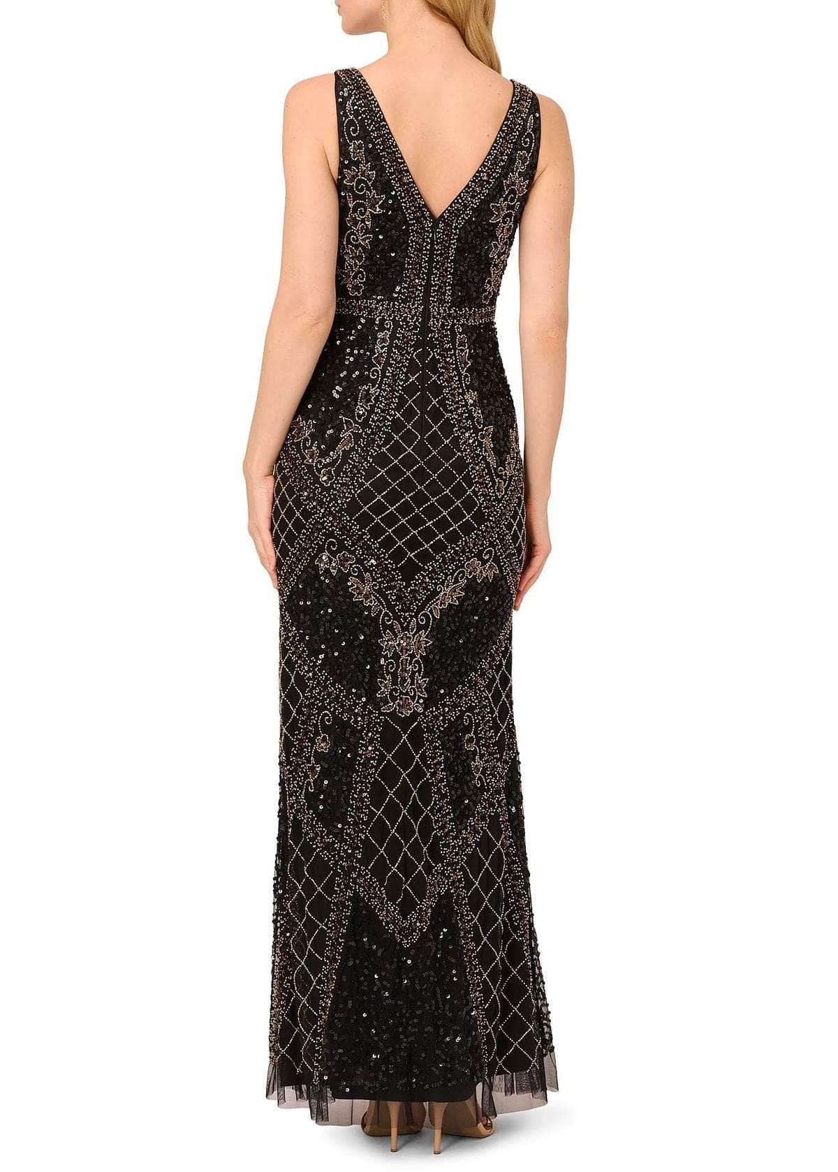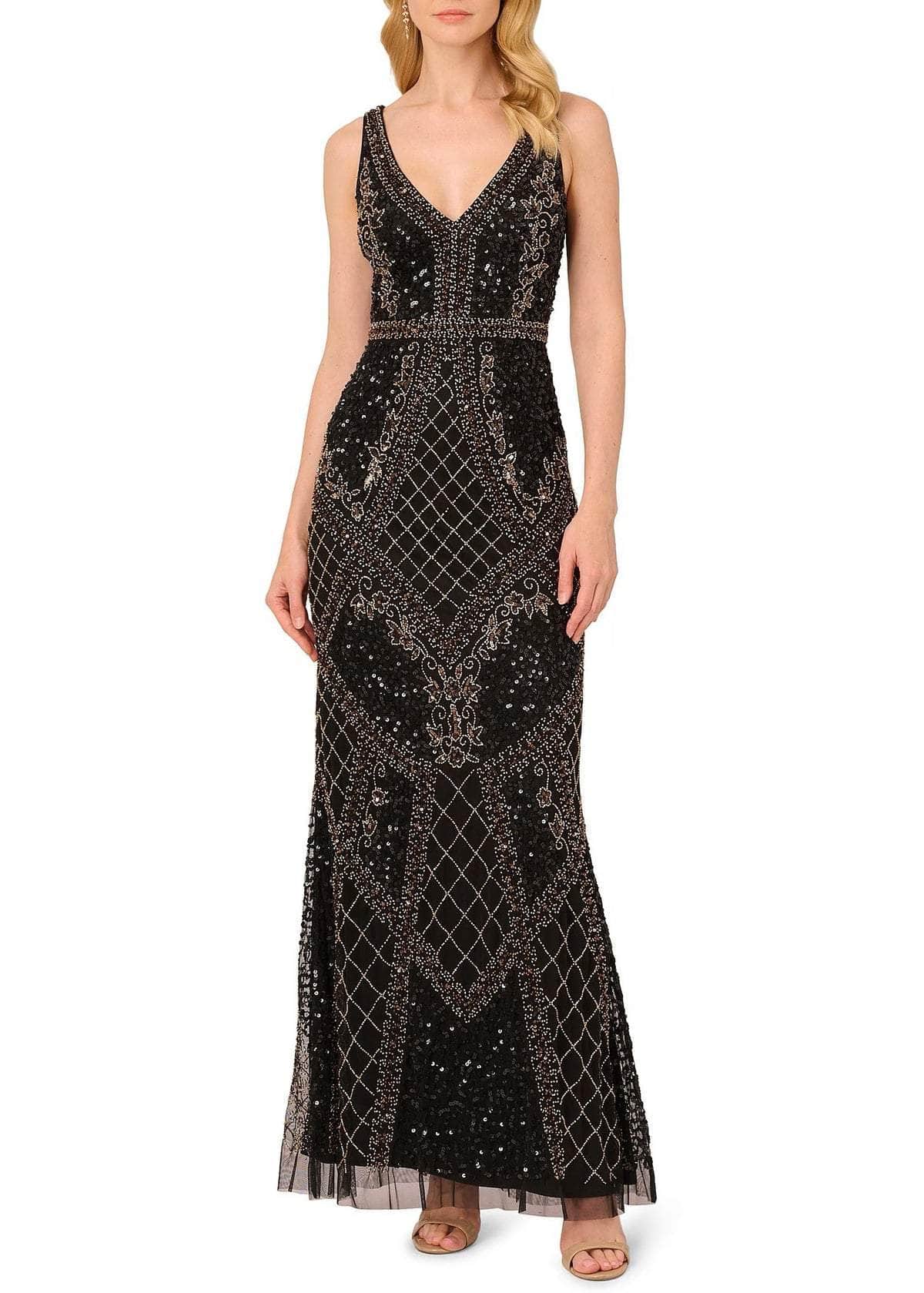 The Adrianna Papell AP1E210783 Dress is a gorgeous design made of opulent beaded mesh fabric that exudes timeless beauty. This stunning dress has a classy V-neckline that elegantly highlights the décolletage and a sleeveless bodice. Perfect fit is guaranteed thanks to the covert zipper closing on the back. The floor-length skirt accentuates your curves and creates a mesmerizing impression as you move, flowing softly into a gorgeous mermaid form. Adrianna Papell AP1E210783 dress is perfect for formal gatherings and special occasions. It's made to make you feel amazing and self-assured. Model is wearing Black color.
