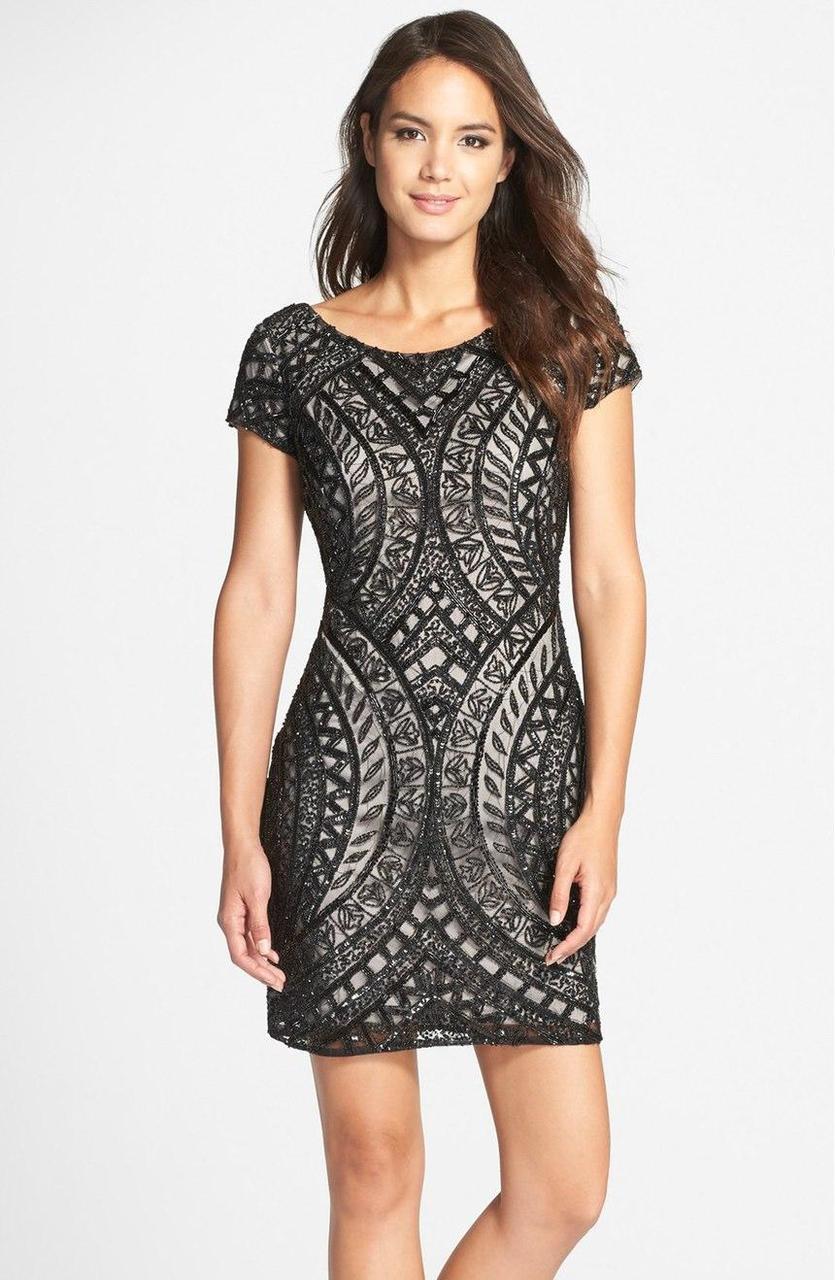 Look stunningly beautiful in this gorgeous embellished Adrianna Papell 41902260 creation. Showing off an intricate mandala-like beadwork on a sheer fabric, this stunning piece offers a bateau neckline, short sleeves and a full back. Molding all throughout the entire silhouette, the sheath skirt flows down to a short hem. Exude beauty and poise in this lovely Adrianna Papell masterpiece. Model is wearing the Black/Silver color.