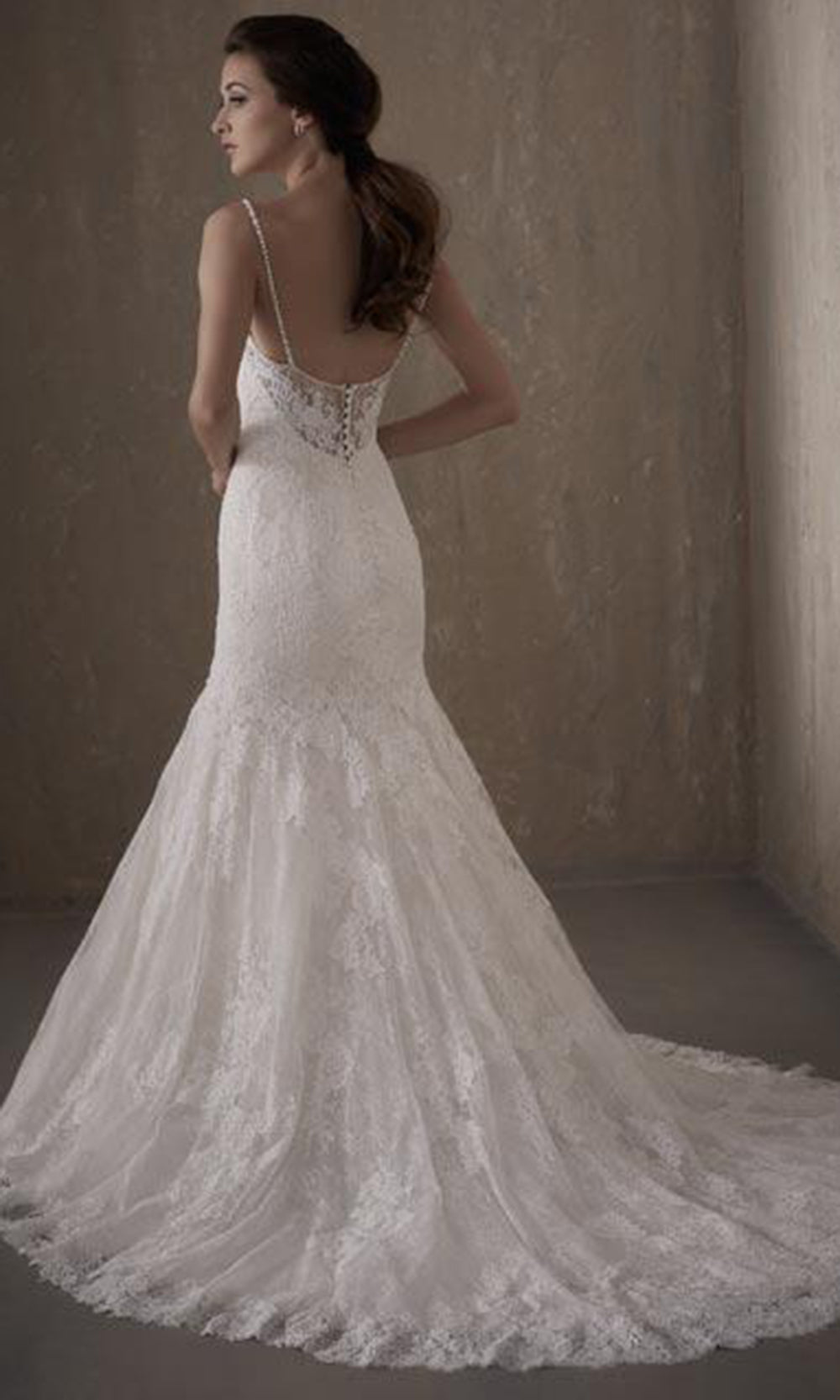 | Details: | Sleeveless, Spaghetti Straps, Sheer Chantilly Lace, Appliques, Scalloped Trims, Sheer Low Back, Buttons, Chapel Train |