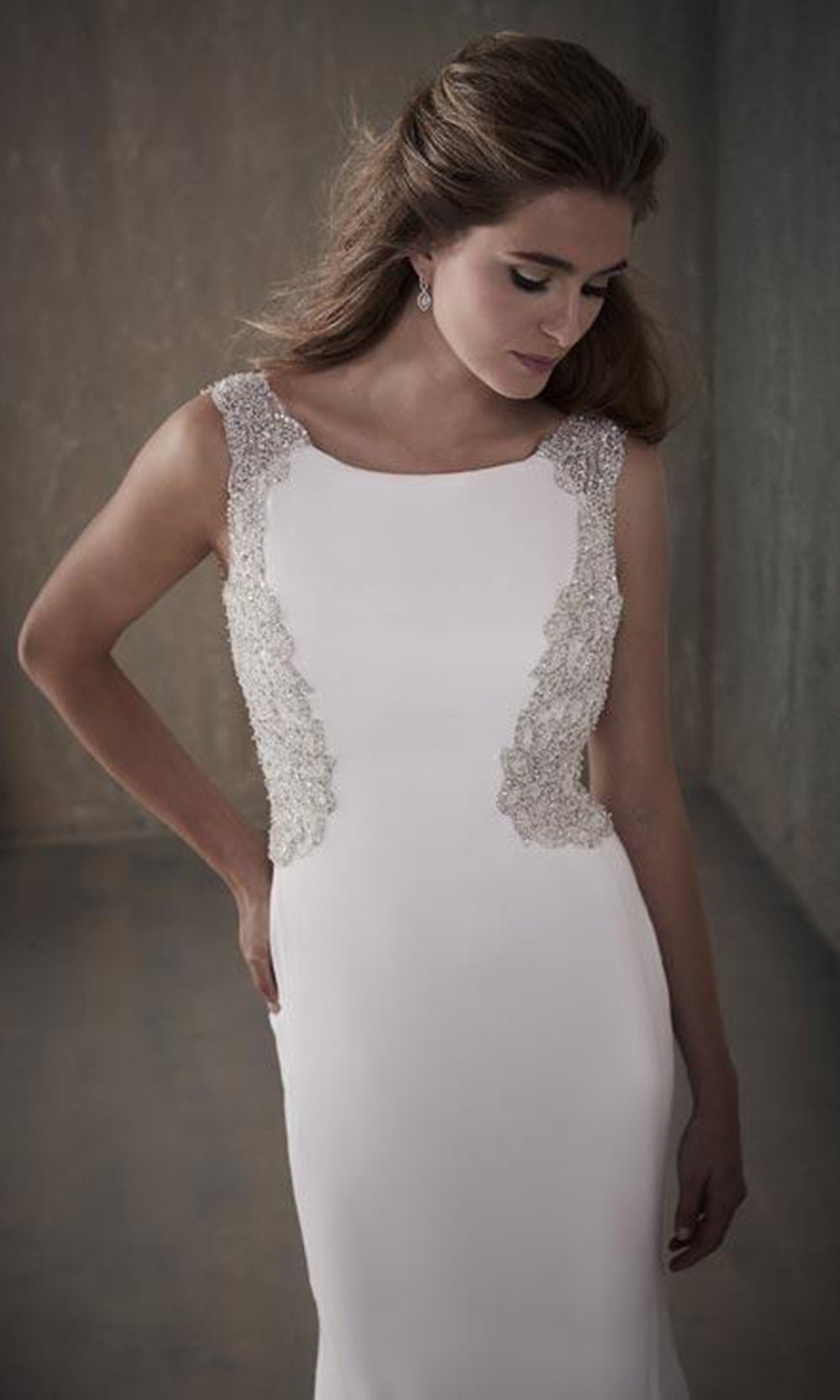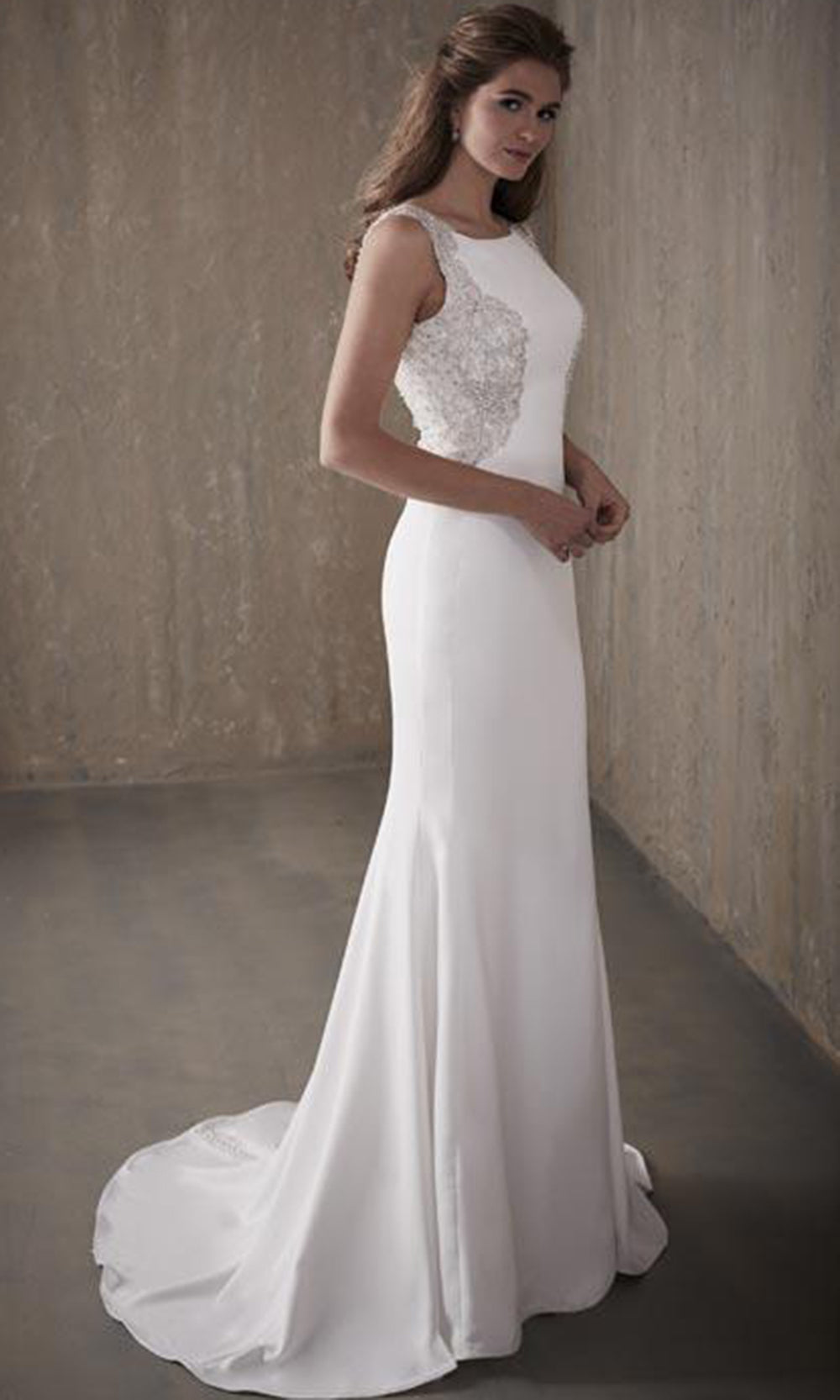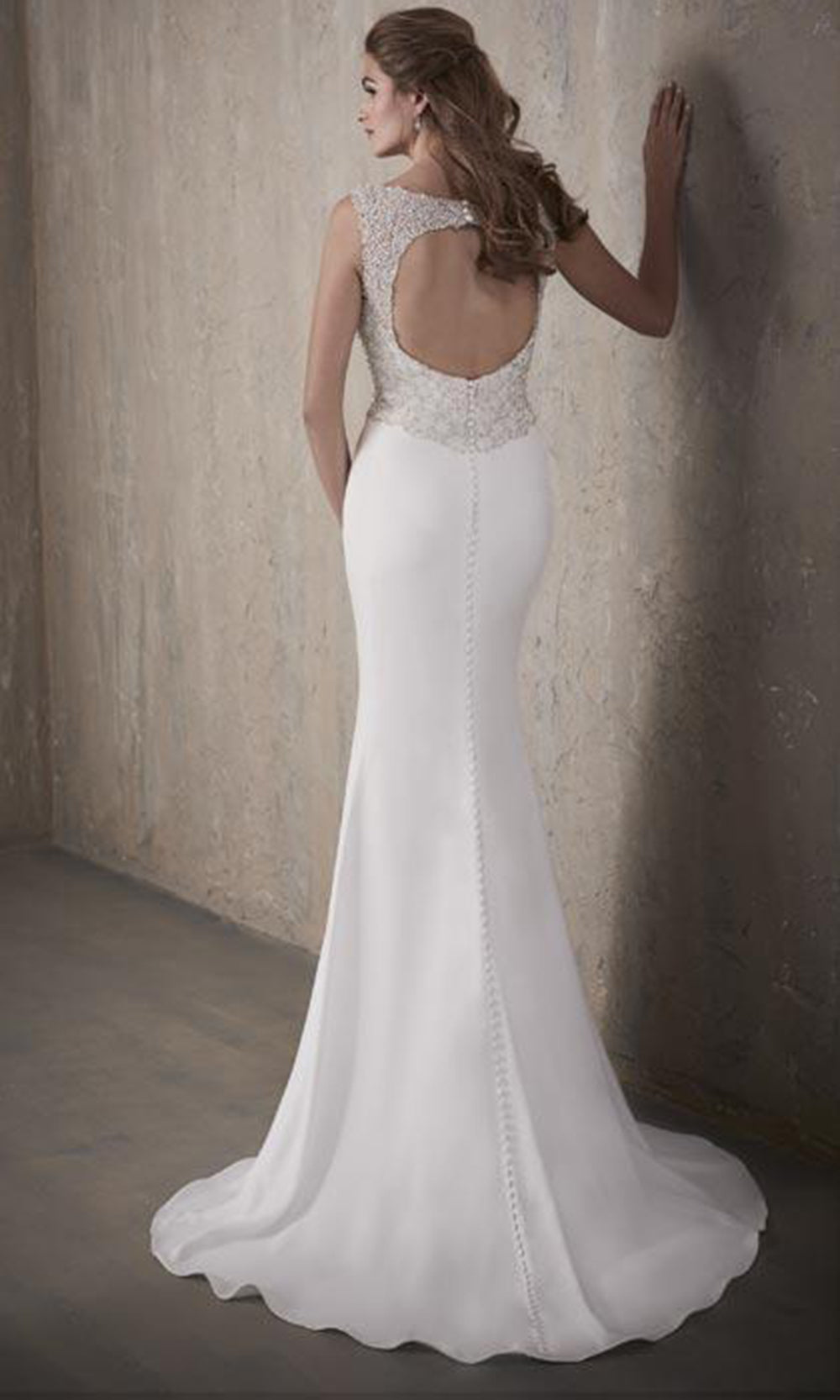 | Details: | Sleeveless, Beaded Sides, Beaded Cutout Back, Fabric Buttons, Sweep Train |