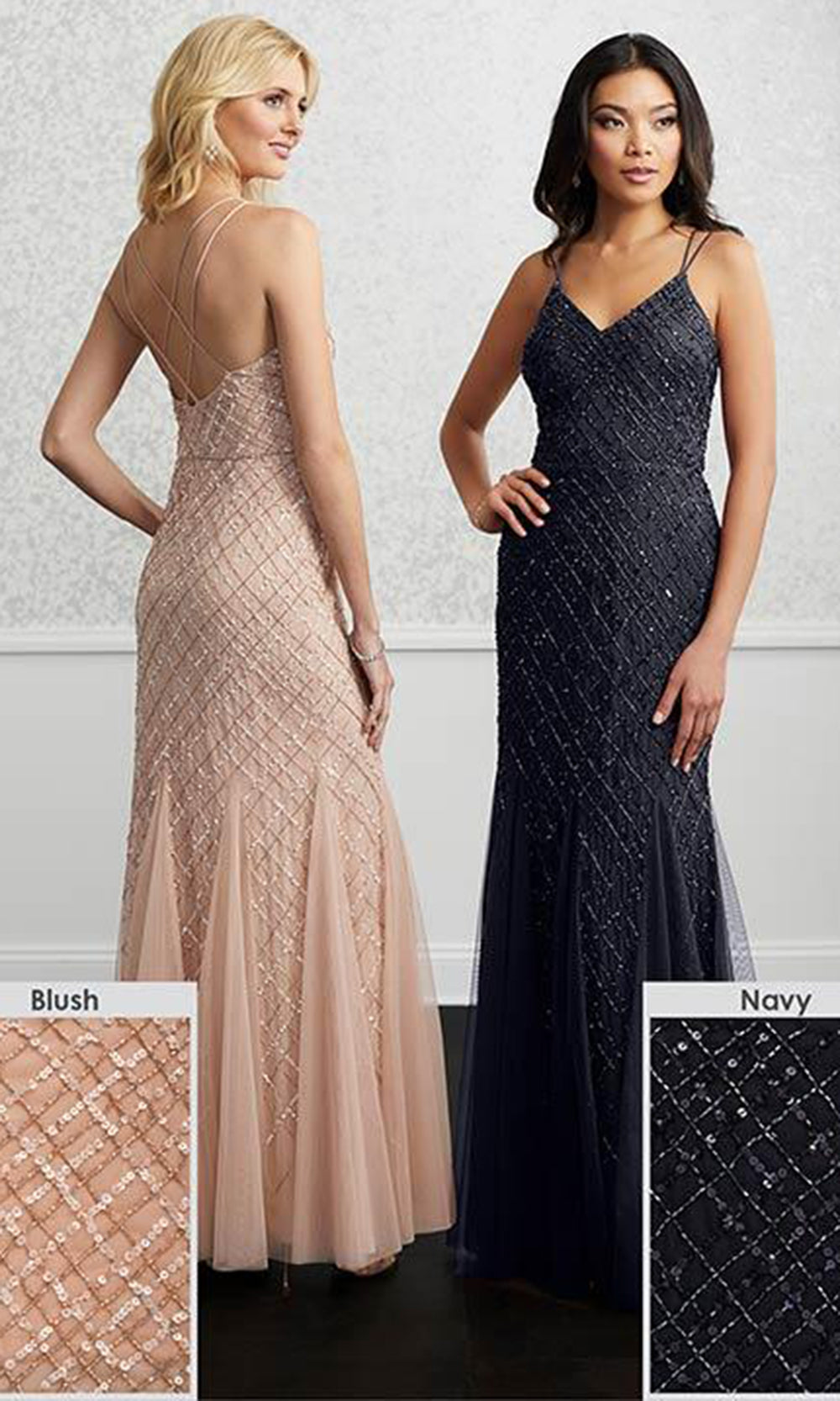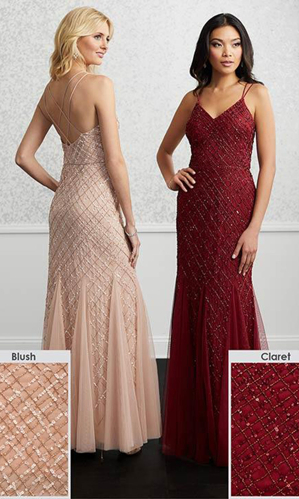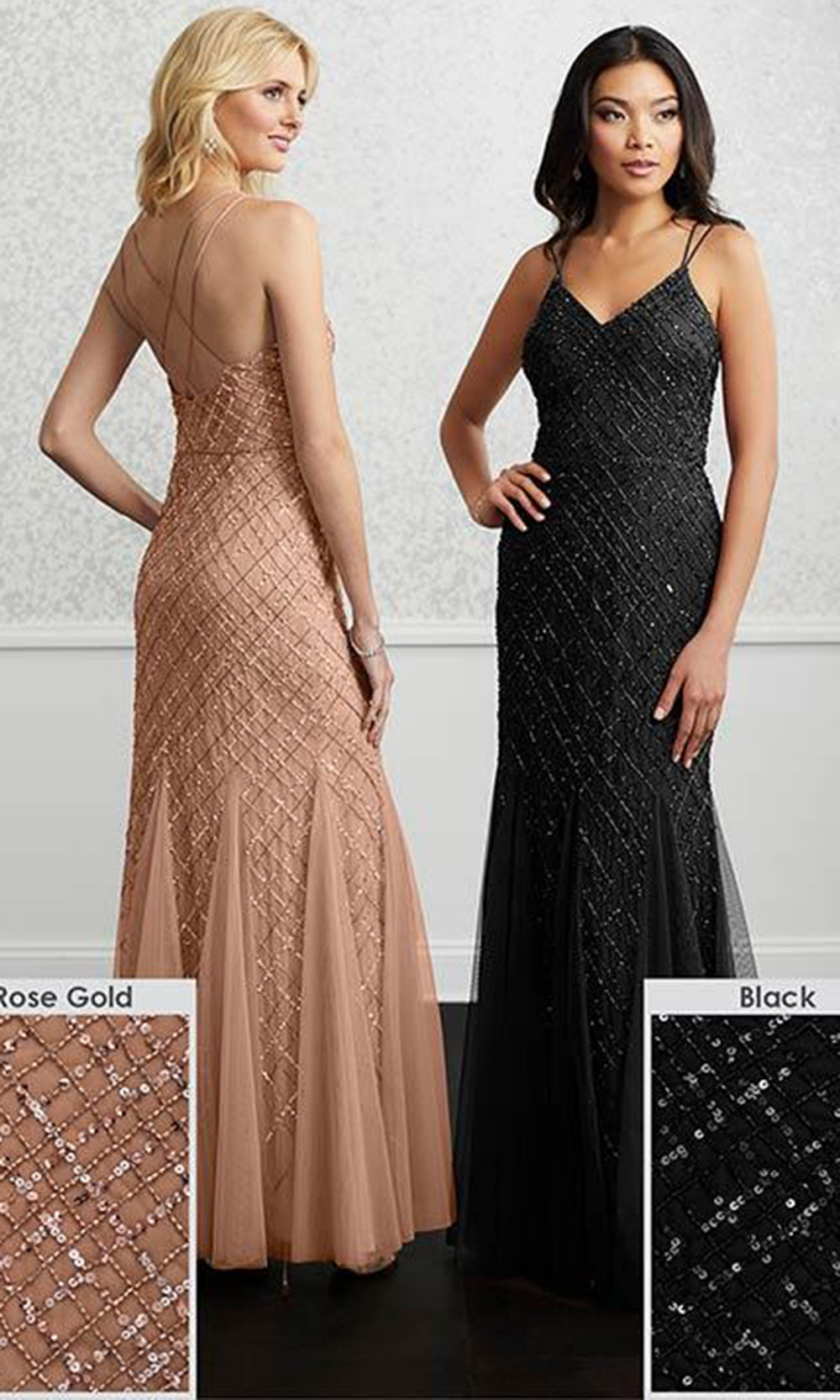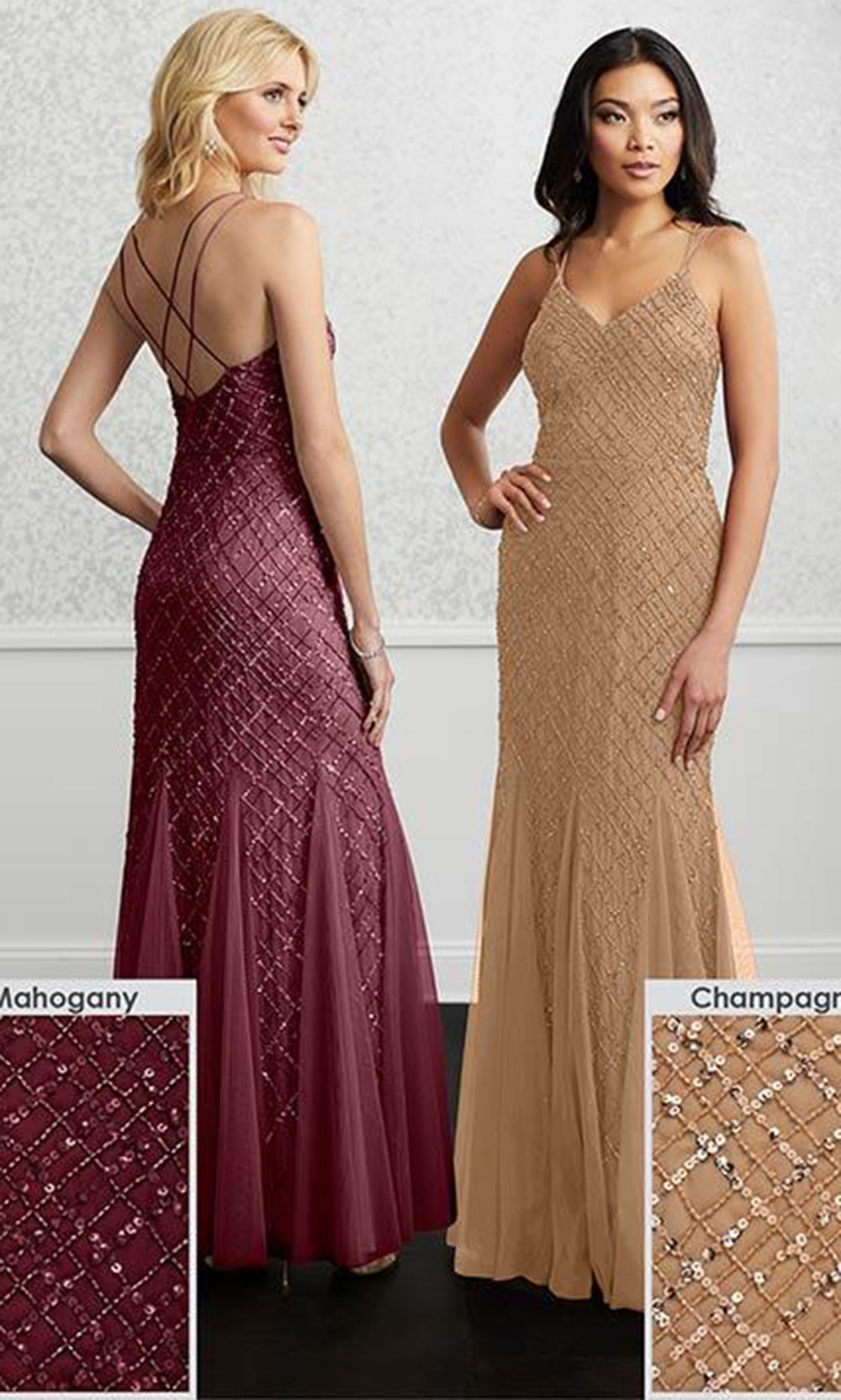 | Details: | Double Spaghetti Straps, Beaded Pattern, Double Crisscross Strapped Back, Back Zipper Closure, Mesh Godets, Full Length Hem |