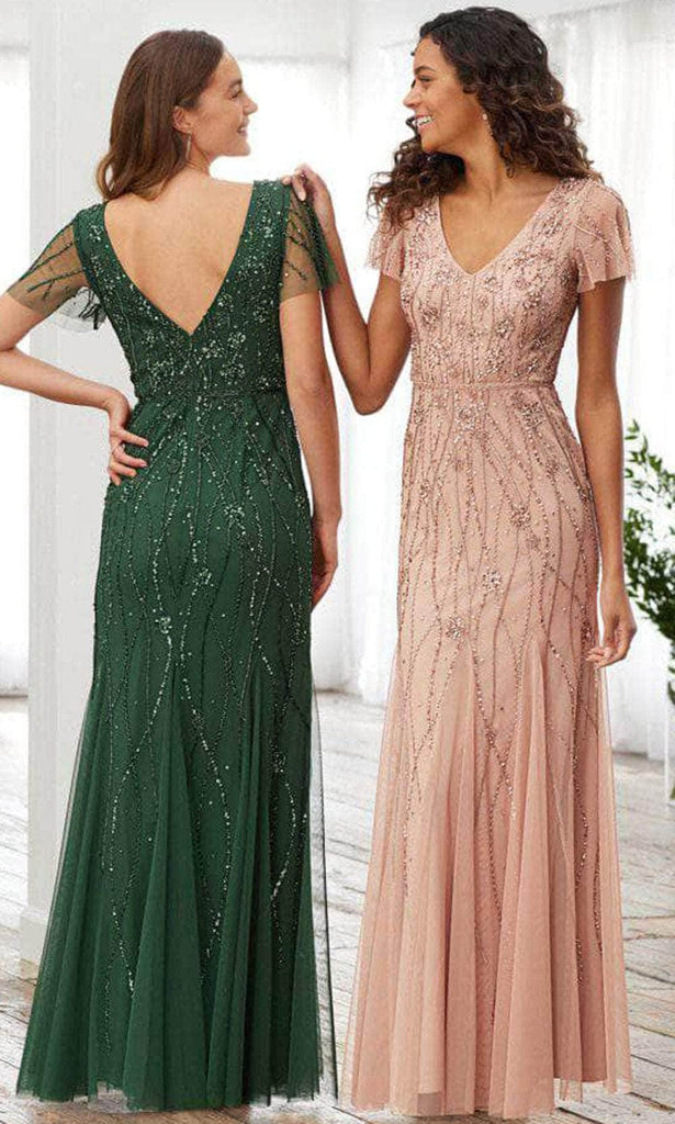 Create a perfect evening wearing this romantic evening dress by Adrianna Papell Platinum 40367. Embellished with intricate beadworks all throughout the dress, this fabulous ensemble features a V-neckline with sheer short sleeves. The beaded waistband accentuates the curves as the back offers a glimpse of skin in a V-shaped cut. Gossamer godets are featured at the skirt and flares in a full-length hem. Charm everyone from all angles as you shine all night long in this Adrianna Papell Platinum masterpiece. Models are wearing Hunter Green and Rose Gold colors.