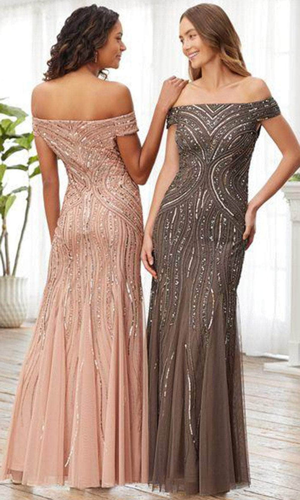 Dare to bare in this decadent evening dress by Adrianna Papell Platinum 40370. Crusted with intricate sequin and bead works all throughout the dress, this beautiful piece showcases a straight across neckline in an off-shoulder figure hugging bodice. The skirt tapers at the thighs and flares at the bottom and is styled with lavish godets. Reveal that inner goddess in you in this Adrianna Papell Platinum masterpiece. Models are wearing Rose Gold and Lead colors.