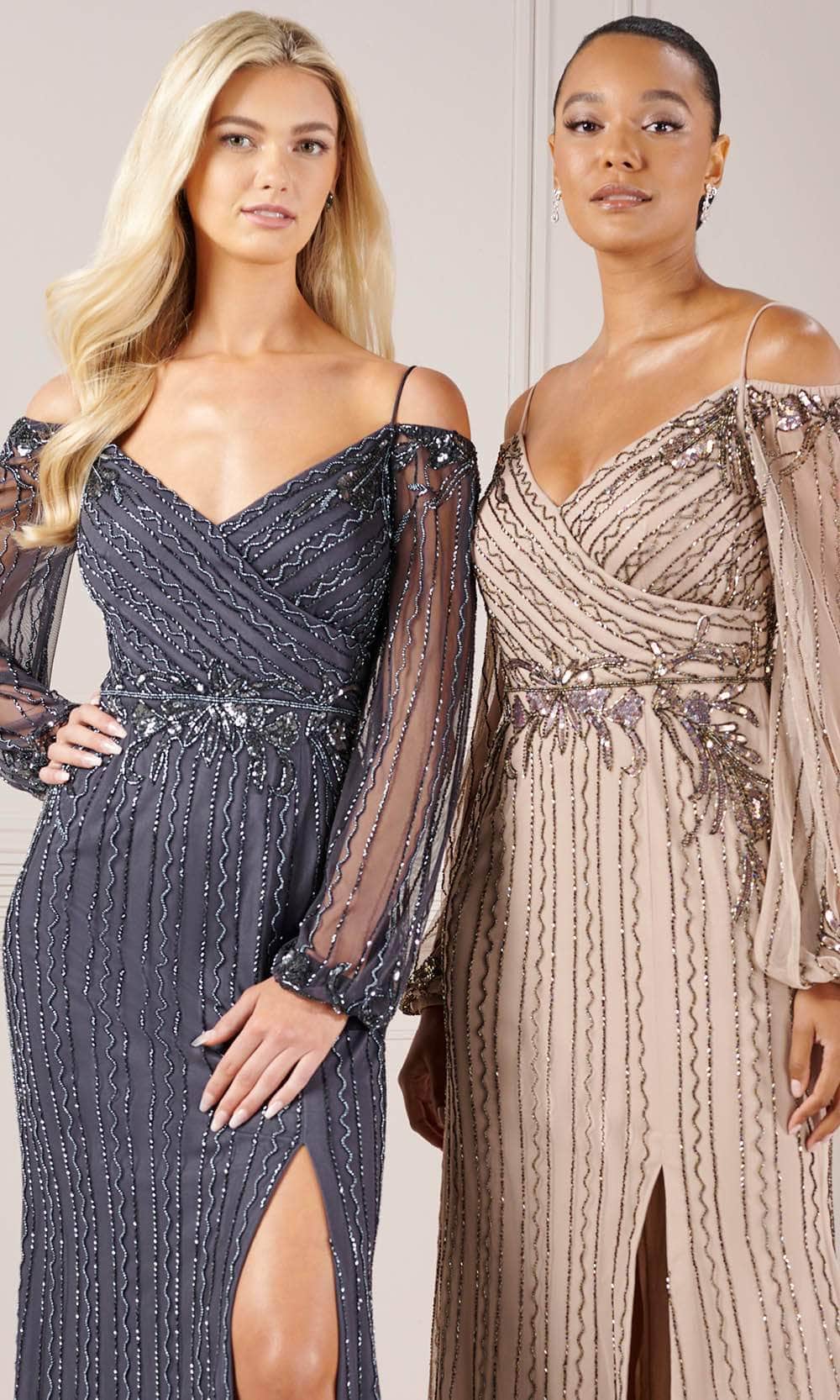 Indulge in the exquisite Adrianna Papell Platinum 40437, a slim sheath silhouette dress that effortlessly combines sophistication and allure. Adorned with a linear allover beaded design, this dress exudes timeless elegance. The surplice bodice, complemented by cold shoulder spaghetti straps and sheer beaded bishop sleeves, adds a touch of glamour. With a captivating front side slit. Adrianna Papell Platinum 40437 a stunning cocktail dress that will make you the center of attention, is the perfect way to start the evening. Models are wearing Sage and Gunmetal colors.