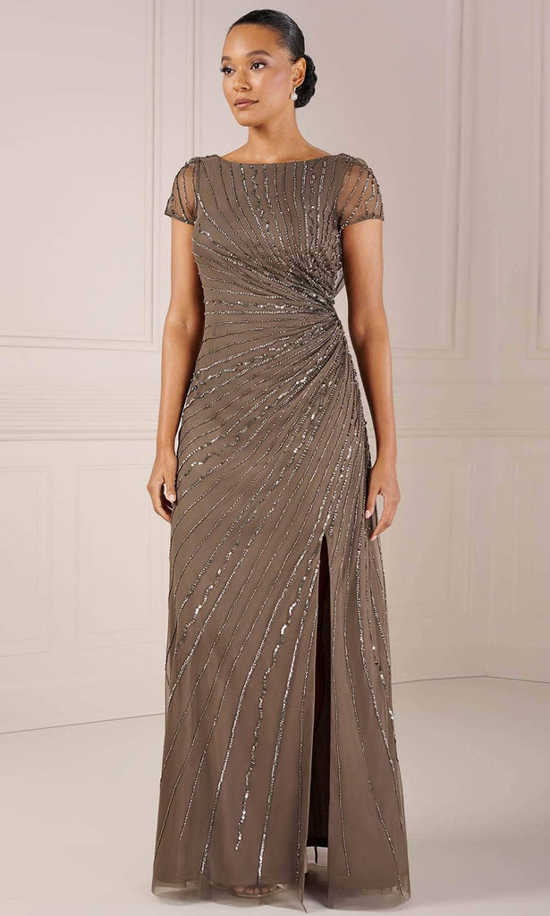 Step into elegance with Adrianna Papell Platinum Alluring 40438, an evening gown that seamlessly combines sophistication and allure. The intricate allover beaded pattern, bursting from the side waist, creates an enchanting and captivating effect on the sheath silhouette. The bateau neckline and sheer cap sleeves add a touch of grace, while the front side slits lend an alluring appeal. With a draped back cowl enhancing its elegance. Adrianna Papell Platinum 40438 will make you the focus of attention. Models are wearing Lead, and Navy colors.