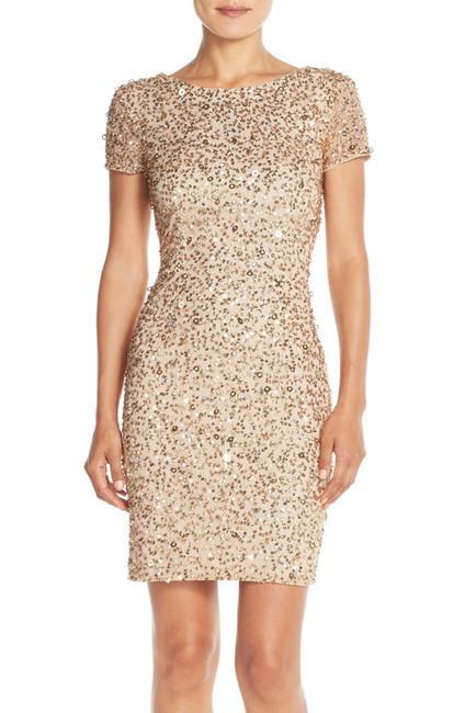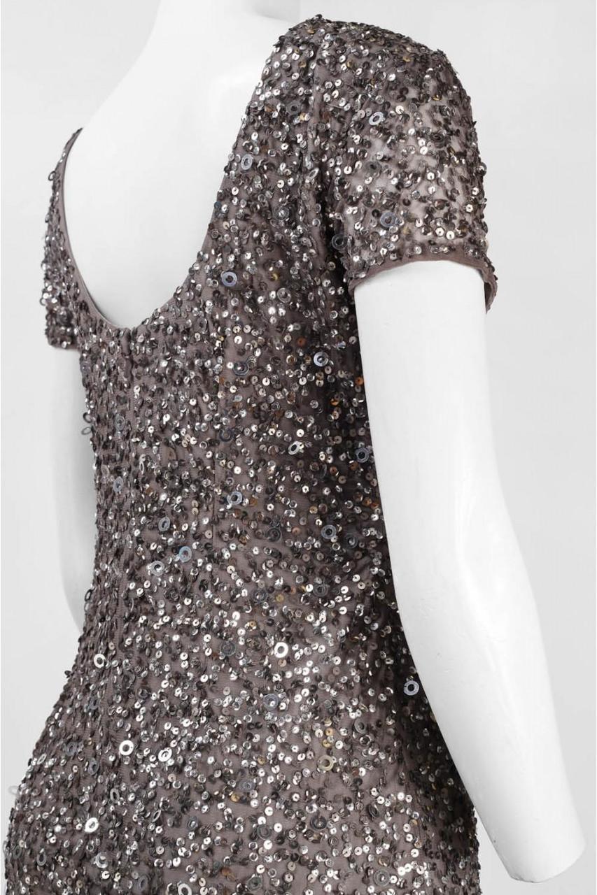 Shine glamorously from all angles in this highly-embellished Adrianna Papell 41900220 creation. Enticingly luminous with shining sequins on a mesh fabric, this radiant piece shows a bateau neckline, sheer ornate short sleeves and a scoop open back. Flowing from every curve with impeccable grace, the sheath skirt finishes down at a knee length hem. Make the most stunning sight as you walk into a party in this shimmering Adrianna Papell masterpiece.