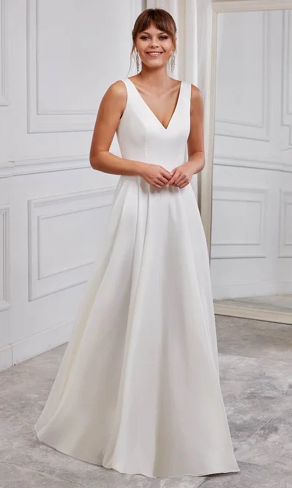 Aerie Couture style 2006 offers a refined and timeless bridal look designed for the modern romantic. This gown features a graceful V neckline paired with a clean structured bodice that creates an elegant and polished silhouette. The soft A line skirt flows effortlessly, delivering movement and simplicity that feels both classic and contemporary. Its minimalist finish ensures that every detail remains focused on pure sophistication. For brides seeking understated beauty that leaves a lasting impression, Aerie Couture style 2006 is the perfect choice. Model is wearing Diamond White color.