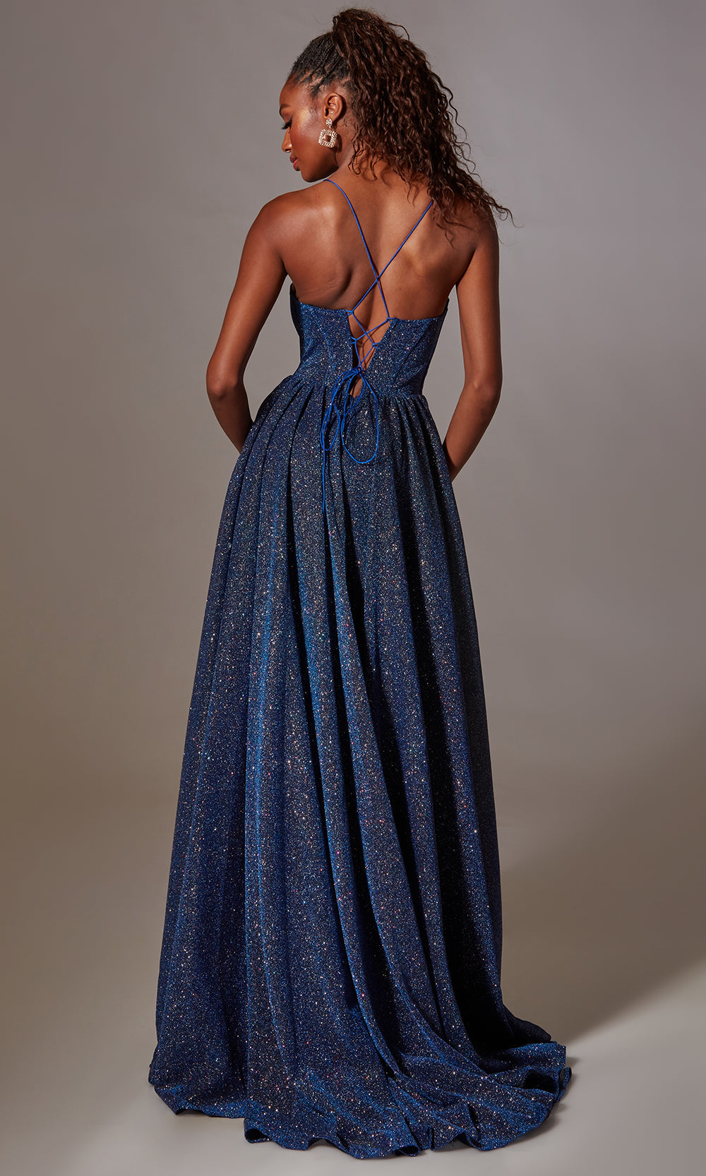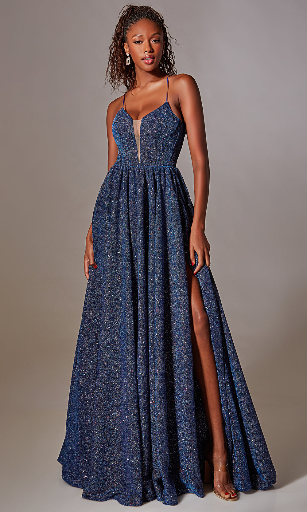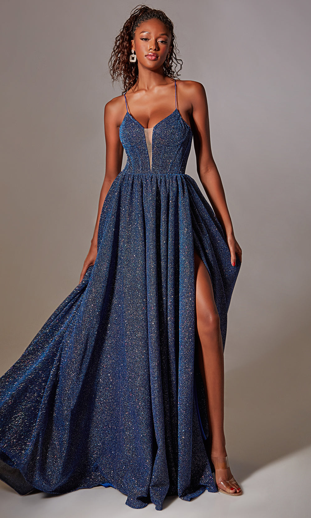 Aerie Couture Style 201 brings bold presence and refined structure to the evening wear collection. With slender spaghetti straps and a deep V bodice enhanced by an illusion inset, this gown frames the upper silhouette with modern elegance. The glitter stretch fabric hugs the form as it flows into a sweeping skirt with a striking high leg slit that allows movement and flair. Whether you’re attending a gala, prom or formal celebration, Aerie Couture Style 201 is crafted to make your moment unforgettable. Model is wearing Navy color.