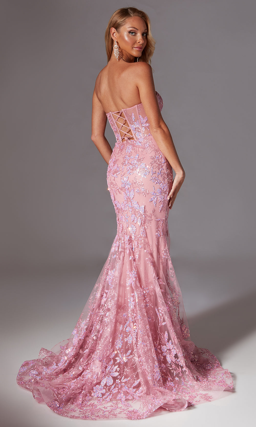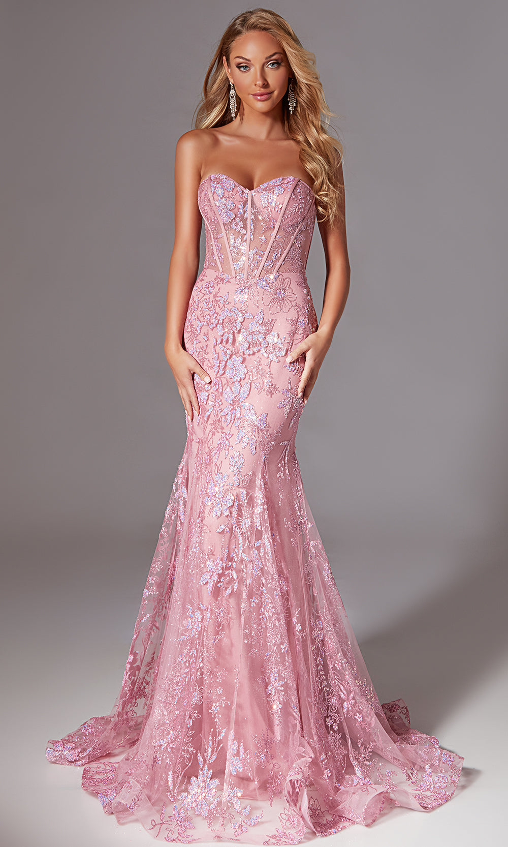 Aerie Couture Style 204 introduces a captivating design that blends elegance with modern glamour. This stunning gown features a strapless sweetheart neckline and a sheer corset bodice enhanced with visible boning for shape and definition. The fitted mermaid silhouette is adorned with intricate floral applique and sequins, creating a shimmering finish from top to hem. A lace up back completes the look with a touch of sophistication and adjustability. Step into your next event with confidence and grace wearing Aerie Couture Style 204, a breathtaking choice for unforgettable celebrations. Model is wearing Pink color.
