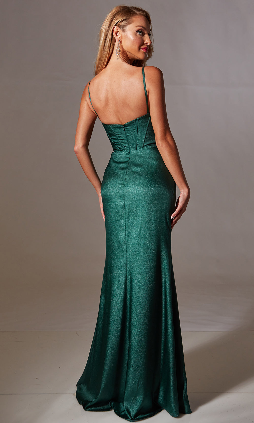 | Details: | Cowl neckline, Spaghetti straps, Corset style bodice, High leg slit, Fitted silhouette, Floor length skirt, Sweep train, Sleek shimmer fabric |