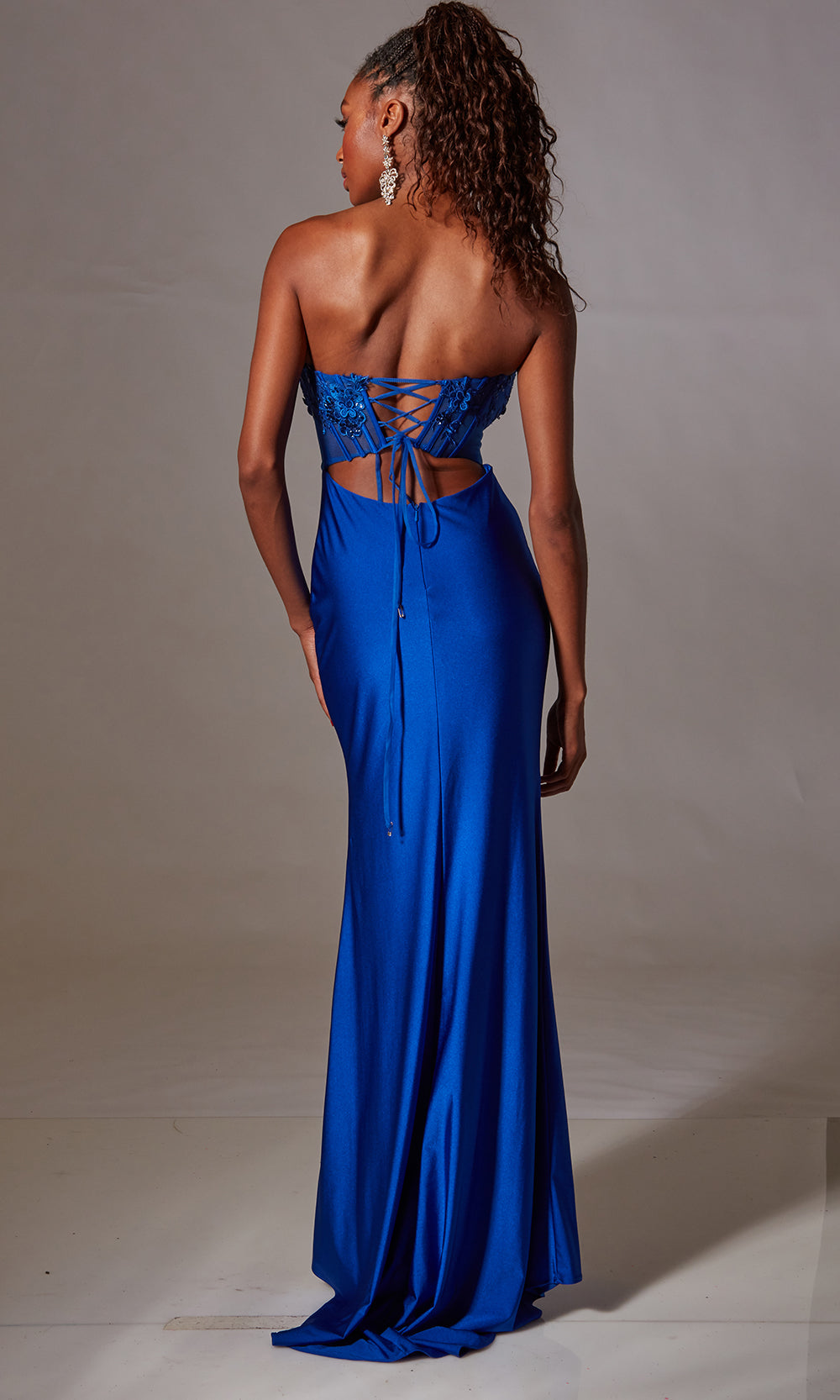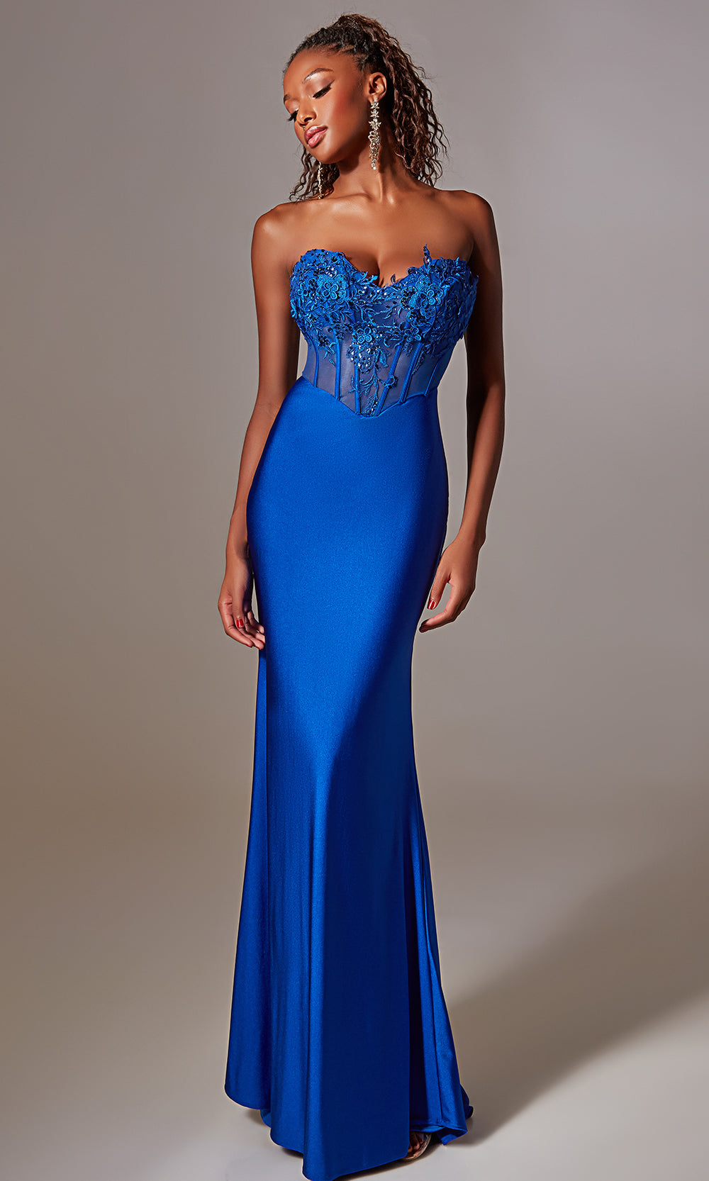Aerie Couture style 248 brings a striking balance of structure and softness, perfect for making an unforgettable impression. The strapless sweetheart neckline pairs beautifully with a sheer corset bodice adorned in floral applique, creating dimension and visual interest. Its fitted silhouette glides effortlessly over the figure, flowing into a smooth floor length skirt for a refined finish. A lace up back completes the gown with both adjustability and elegance. Elevate your special occasion look with the refined artistry of Aerie Couture style 248. Model is wearing Royal color.