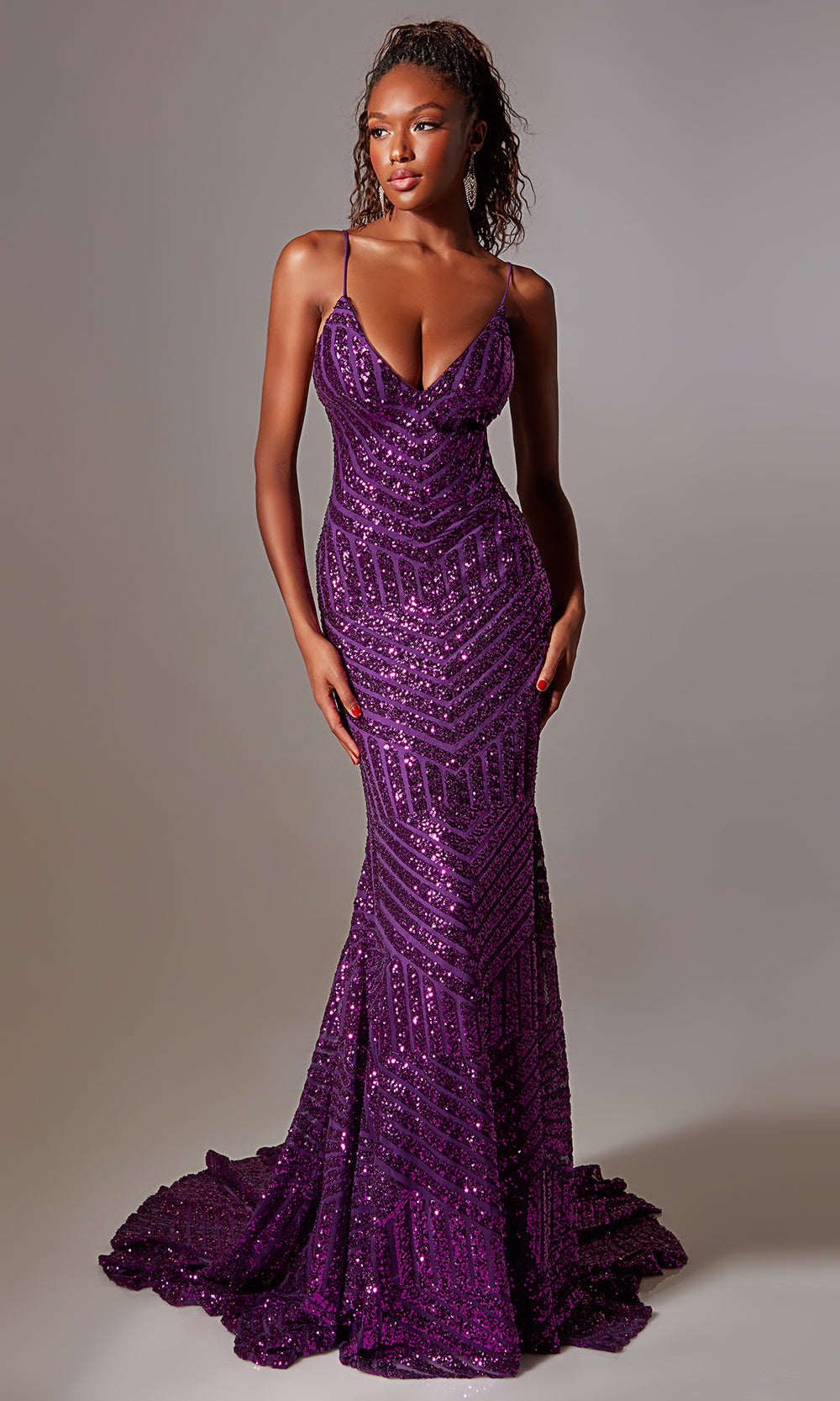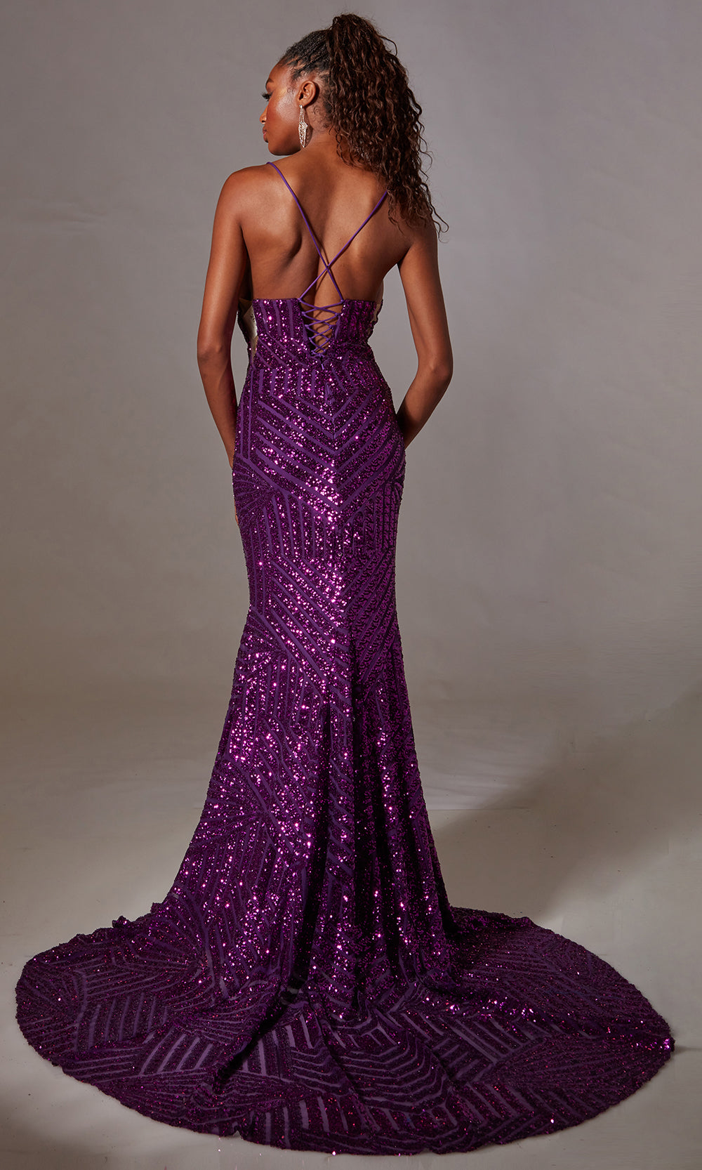 Aerie Couture Style 263 presents a radiant blend of elegance and bold structure, designed to flatter from every angle. The sequin-covered fabric drapes the body in shimmering texture while the deep V-neckline and slender straps frame the upper body with refined style. At the back, a lace-up open motif ensures a custom fit and visual drama, while the mermaid silhouette flows into a graceful sweep train for lasting impact. Choose Aerie Couture Style 263 for your next gala, prom or red-carpet event and step into an unforgettable moment. Model is wearing Purple color.