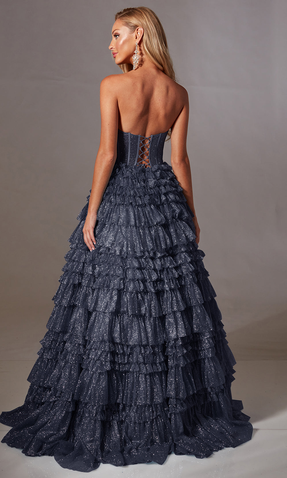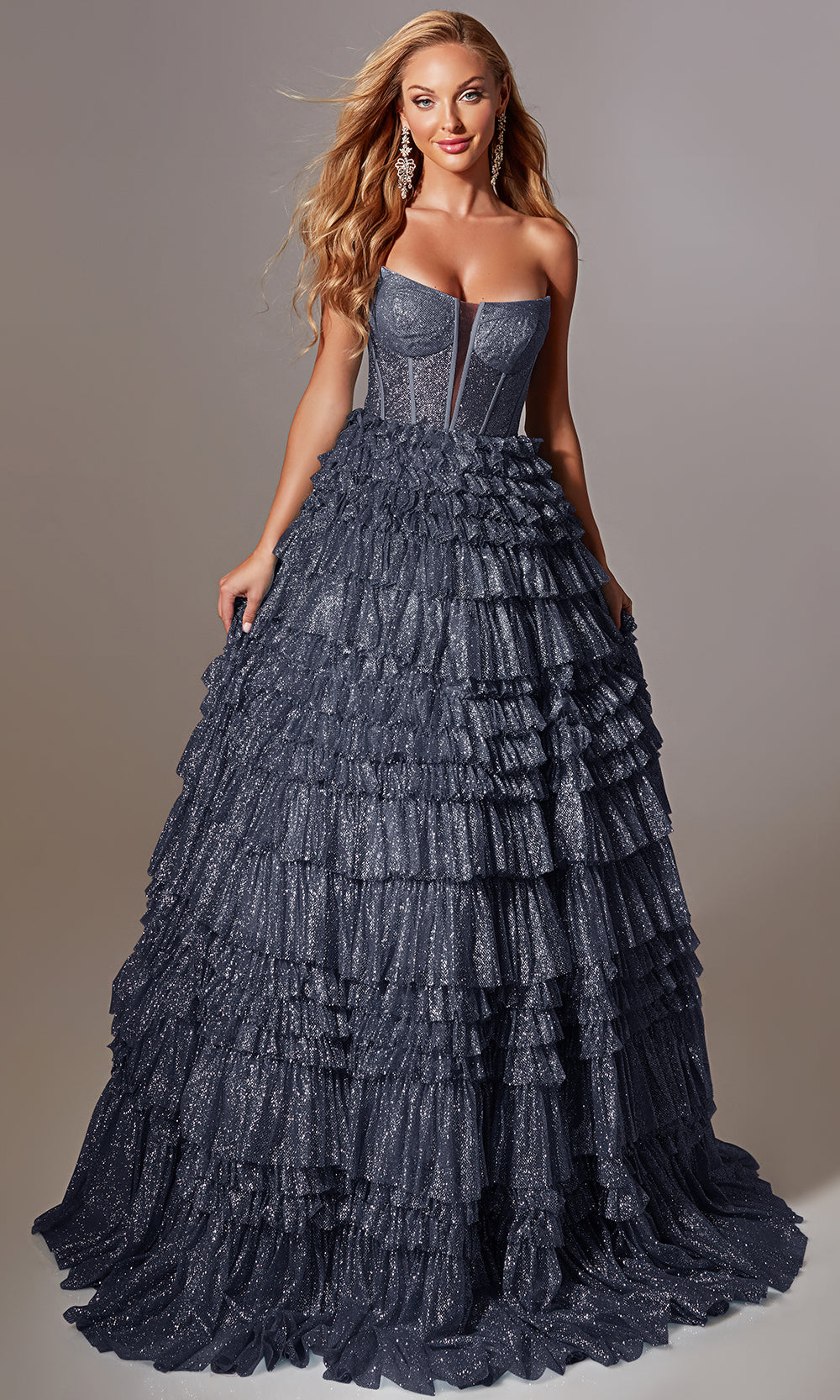 Aerie Couture style 276 introduces a breathtaking gown designed to make an unforgettable entrance. Its strapless neckline pairs beautifully with a sheer structured bodice that highlights the figure while adding an element of modern elegance. The layered ruffle skirt offers dramatic volume with shimmering movement, creating a truly standout silhouette. A lace up back completes the design with a flattering and adjustable finish. Elevate your next special occasion with the refined beauty of Aerie Couture style 276, a gown crafted to captivate from every angle. Model is wearing Midnight color.