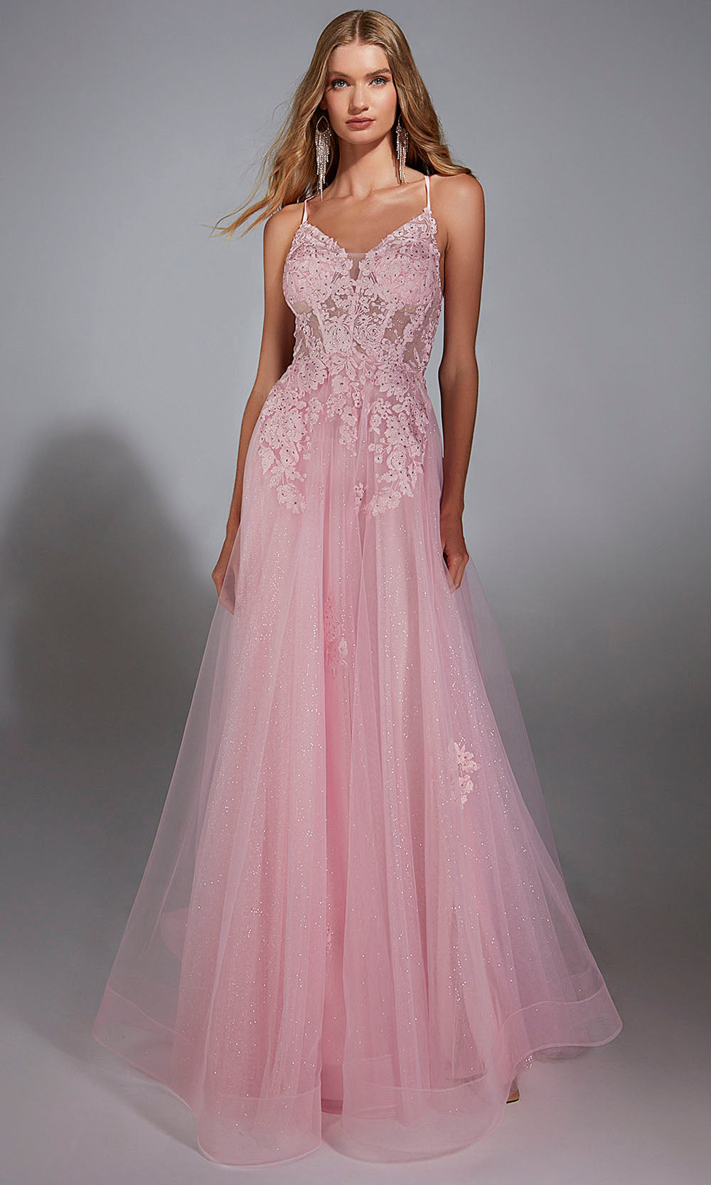 A graceful and airy look defines this soft pink gown, designed to create a romantic presence for any special event. The sheer bodice features floral lace placement that blends beautifully into the layered tulle skirt, adding depth and dimension throughout the silhouette. Delicate straps frame the neckline and guide the eye to the structured lace up back, offering an adjustable fit. The flowing A line skirt is crafted from shimmering tulle that moves effortlessly and enhances the dreamy appeal of the dress. Feminine details, lightweight movement, and soft sparkle come together to create a timeless and enchanting style. Aerie Couture 286. Model is wearing Pink color.