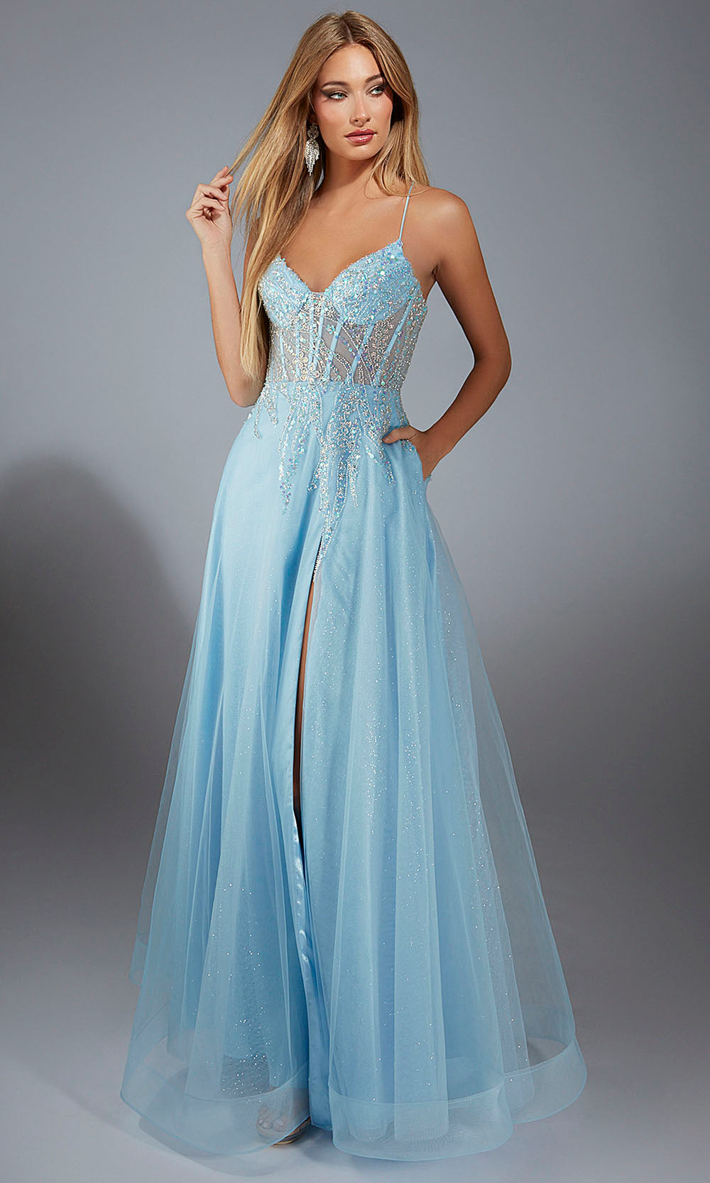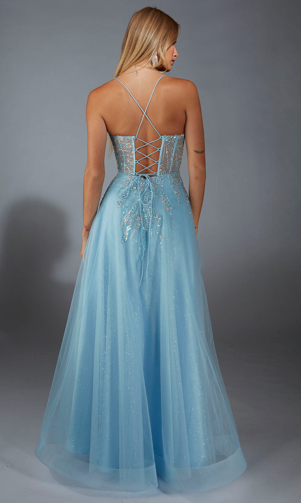 Aerie Couture Style 292 brings a radiant look that blends modern elegance with ethereal charm. This gown features a sheer beaded bodice that highlights the corset structure, creating a sculpted and feminine shape. The delicate spaghetti straps complement the shimmering details that trail into a flowing layered skirt, while the high leg slit adds a bold and graceful touch. The glitter tulle finish completes the design with soft movement and a luminous glow. Make your special event unforgettable in Aerie Couture Style 292, a design created to captivate and inspire. Model is wearing Light Blue color.