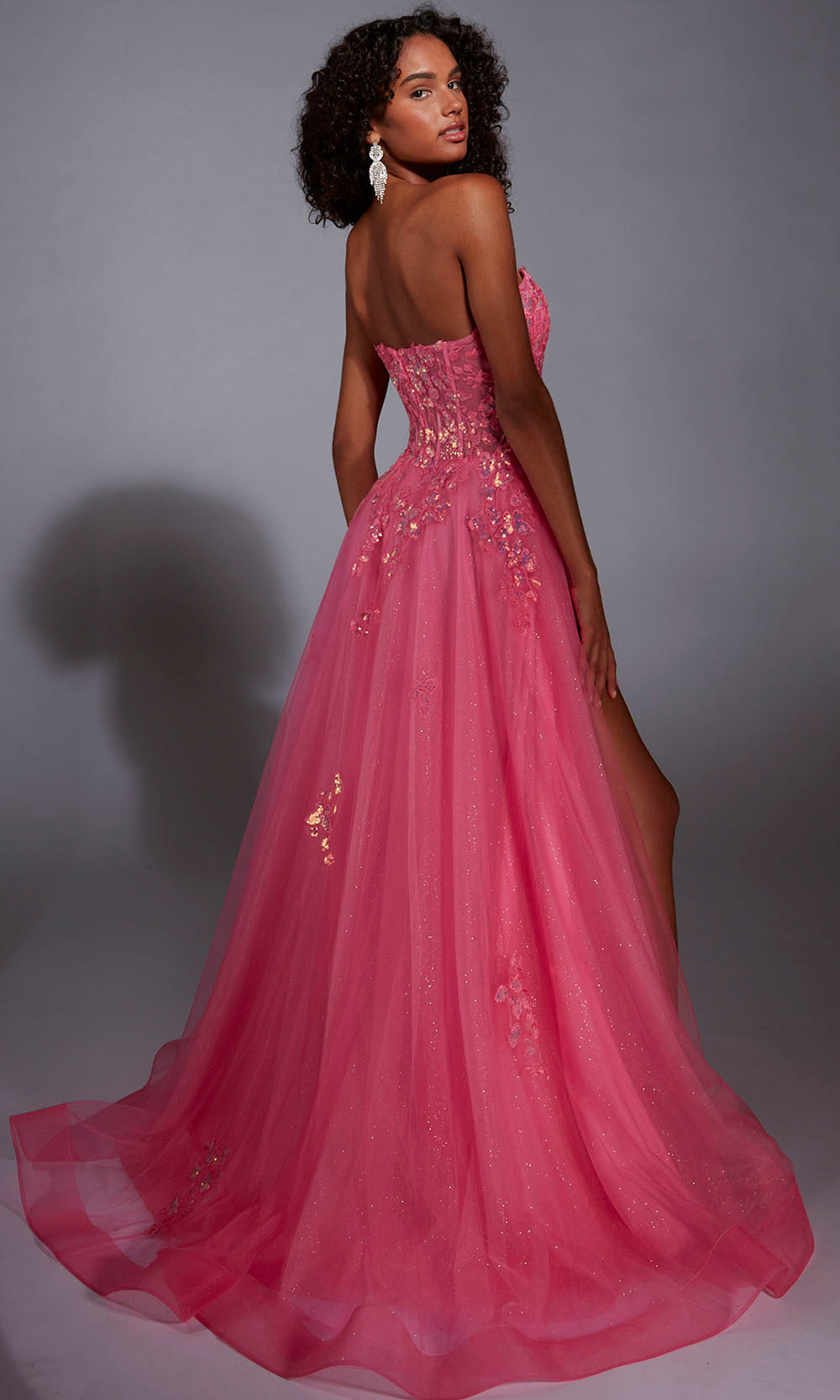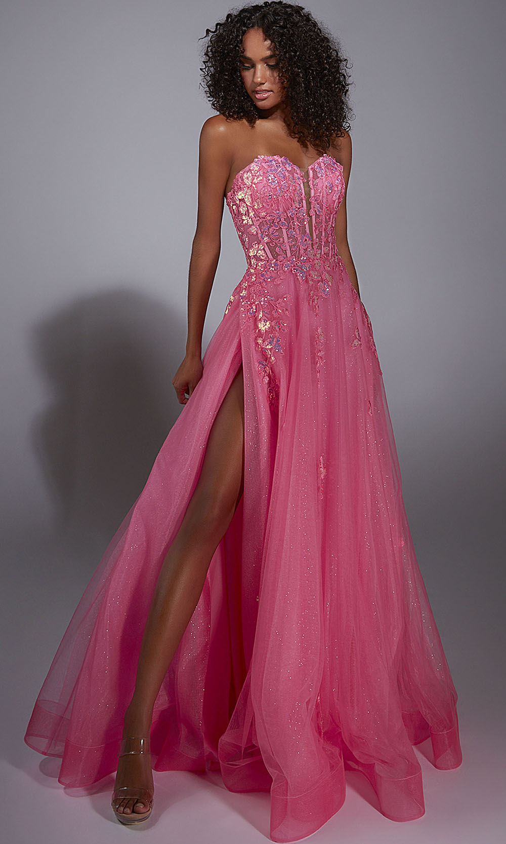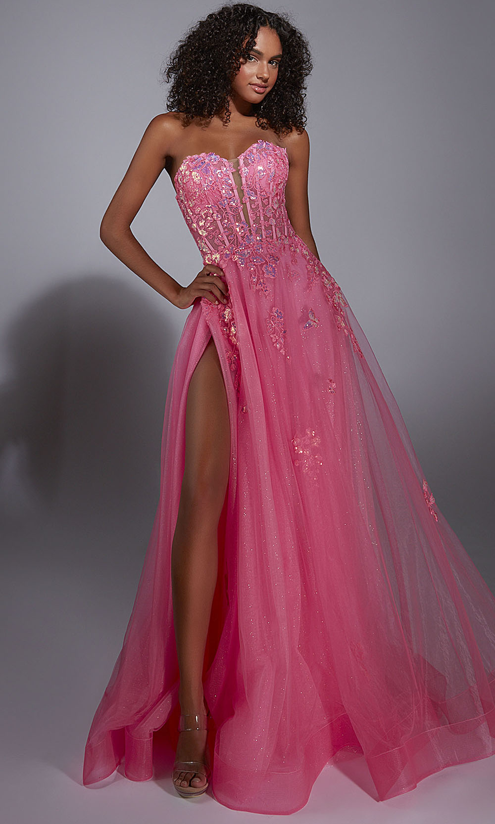 | Details: | Corset-style bodice with exposed boning, Strapless neckline, Glitter tulle overlay, Applique embellishments on bodice and skirt, Full A-line skirt with thigh-high side slit. |