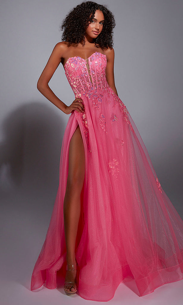 The Aerie Couture Style 298 dress offers a breathtaking blend of structural design and shimmering elegance. A corset-inspired bodice with exposed boning sculpts the waist and enhances the silhouette, while delicate appliques and glitter tulle convey ethereal luxury. With its full A-line skirt and thigh-high side slit, this design creates dramatic movement and captures attention at every step. Make your entrance unforgettable in Aerie Couture Style 298 at your next prom, gala or formal evening. Model is wearing Bubblegum color.