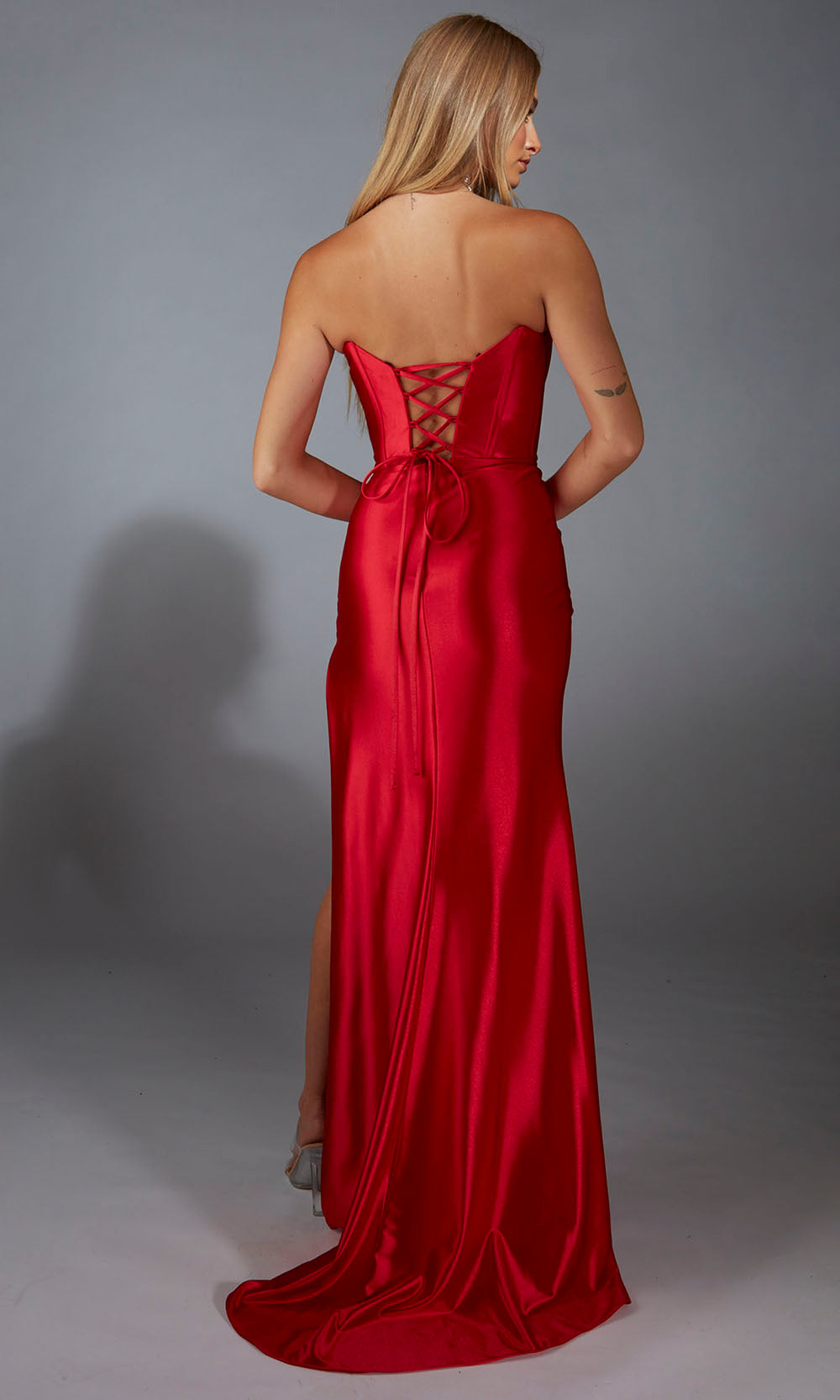 | Details: | Strapless neckline, Sleek satin silhouette, High leg slit, Lace up back, Ruched detailing at hip, Floor length skirt |