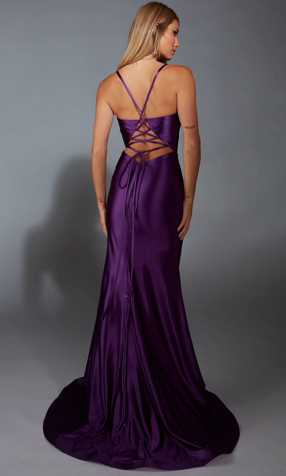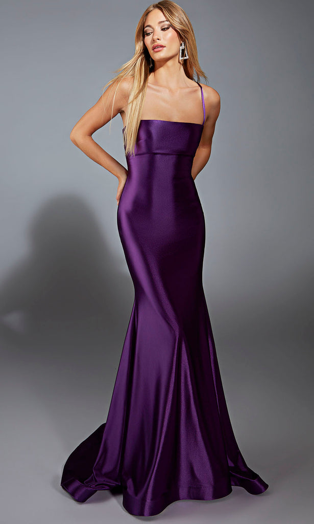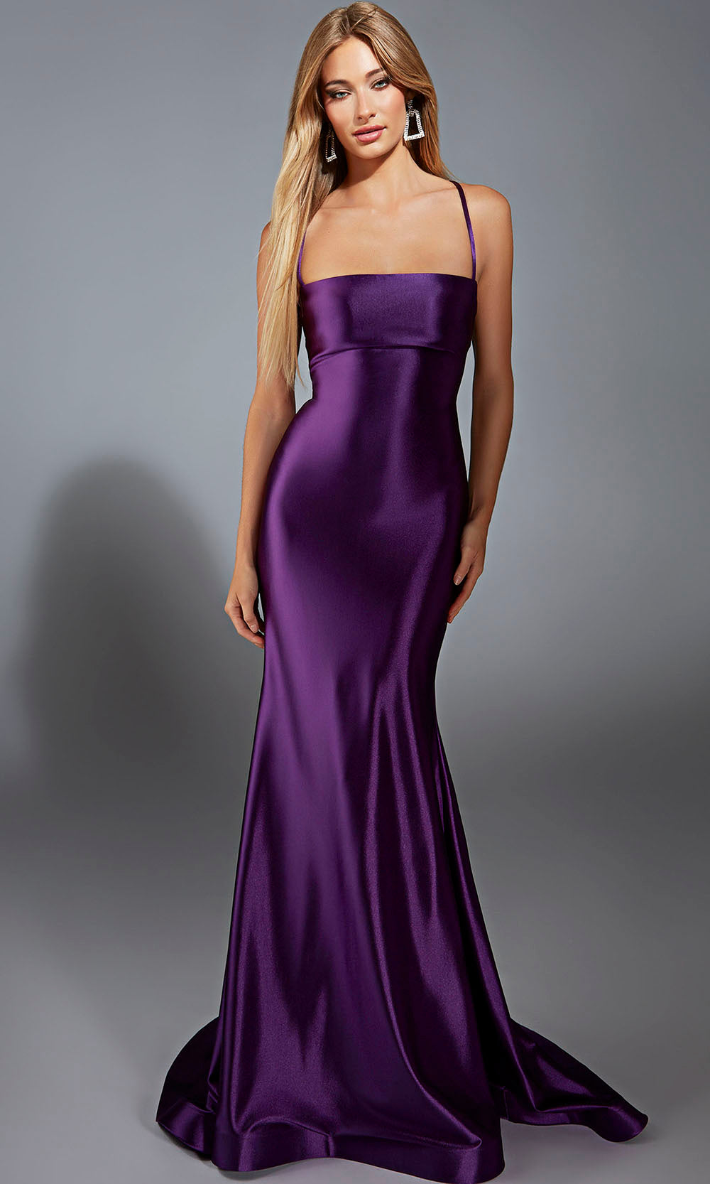 Aerie Couture style number 313 introduces a refined and modern evening look designed to highlight timeless sophistication. This gown features a straight neckline supported by slim straps that create a clean and structured appeal. Its fitted mermaid silhouette follows the natural curves, complemented by a smooth satin finish that adds a polished touch. A lace up open back enhances the design with adjustable comfort and eye catching detail. For formal events or special celebrations, Aerie Couture 313 offers an elegant choice that ensures a confident and graceful entrance. Model is wearing Purple color.