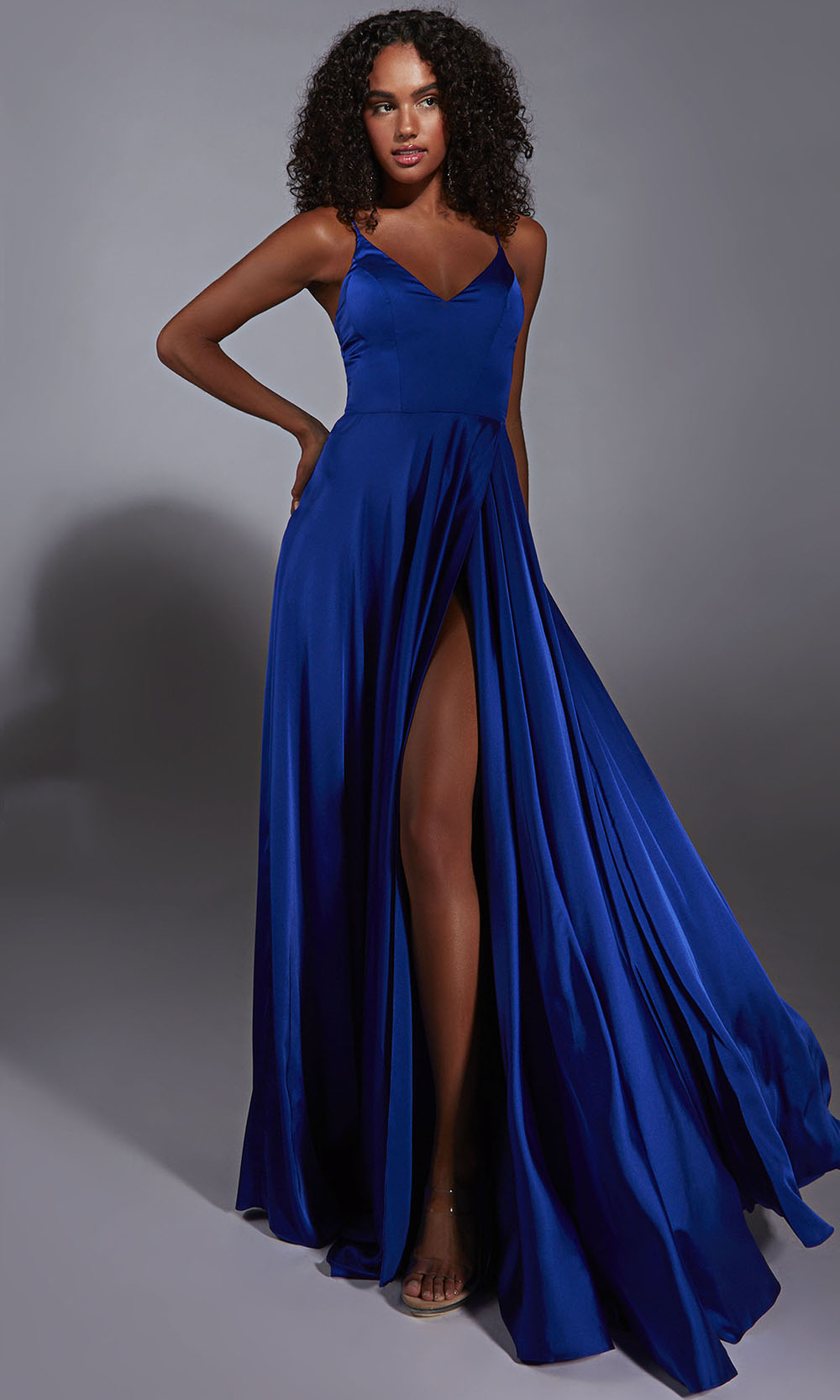 Aerie Couture Style 354 introduces a captivating formal look designed to make every moment unforgettable. This gown highlights a flattering V neckline paired with delicate spaghetti straps that frame the bodice beautifully. The flowing A line skirt drapes effortlessly with a striking high slit that adds movement and drama. A lace up back completes the design, offering an adjustable fit that enhances the silhouette. For any special occasion, Aerie Couture Style 354 delivers sophistication and allure, making it a stunning choice for your next memorable event. Model is wearing Royal color.