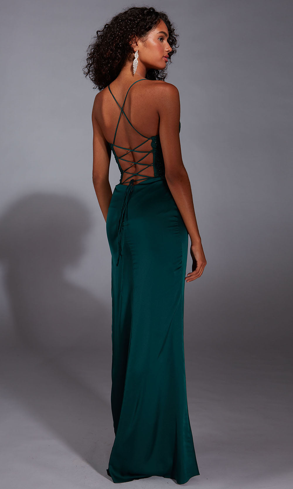 | Details: | Beaded bodice with floral applique, Sheer illusion plunge, High leg slit, Crisscross lace up back, Sleek fitted silhouette |