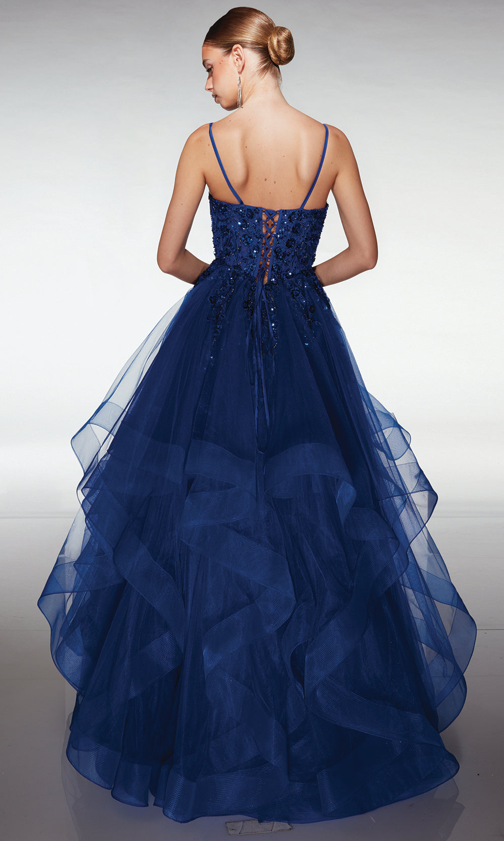 | Details: | Beaded applique bodice, Spaghetti straps, Lace up corset back, Layered tulle ball skirt, Sheer bodice insert |