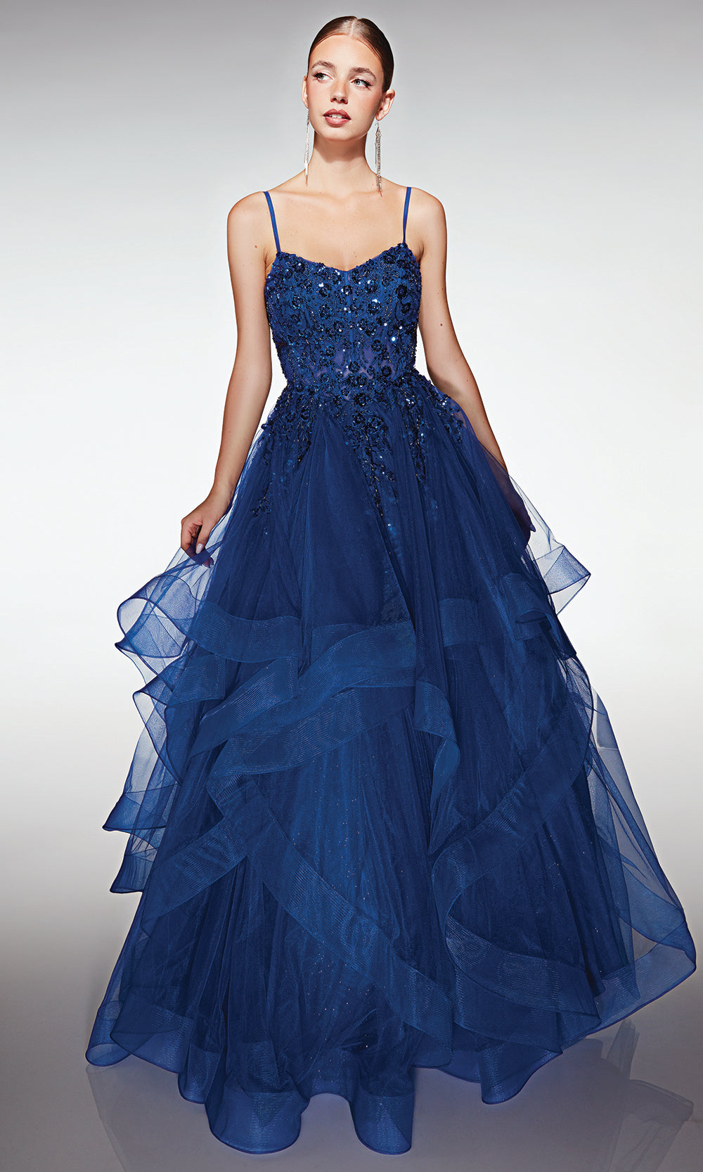 Aerie Couture style 380 presents a dazzling gown designed to elevate formal moments with dramatic flair. The bodice features rich beaded applique and a sheer insert that captures light and adds sculpted dimension, while spaghetti straps give refined support and a graceful neckline. Below, the layered tulle ball skirt flows voluminously for show-stopping movement, and the lace up corset back allows for a custom fit that contours beautifully. Make your grand entrance unforgettable by choosing Aerie Couture style 380 for your next gala, prom or formal celebration. Model is wearing Royal color.