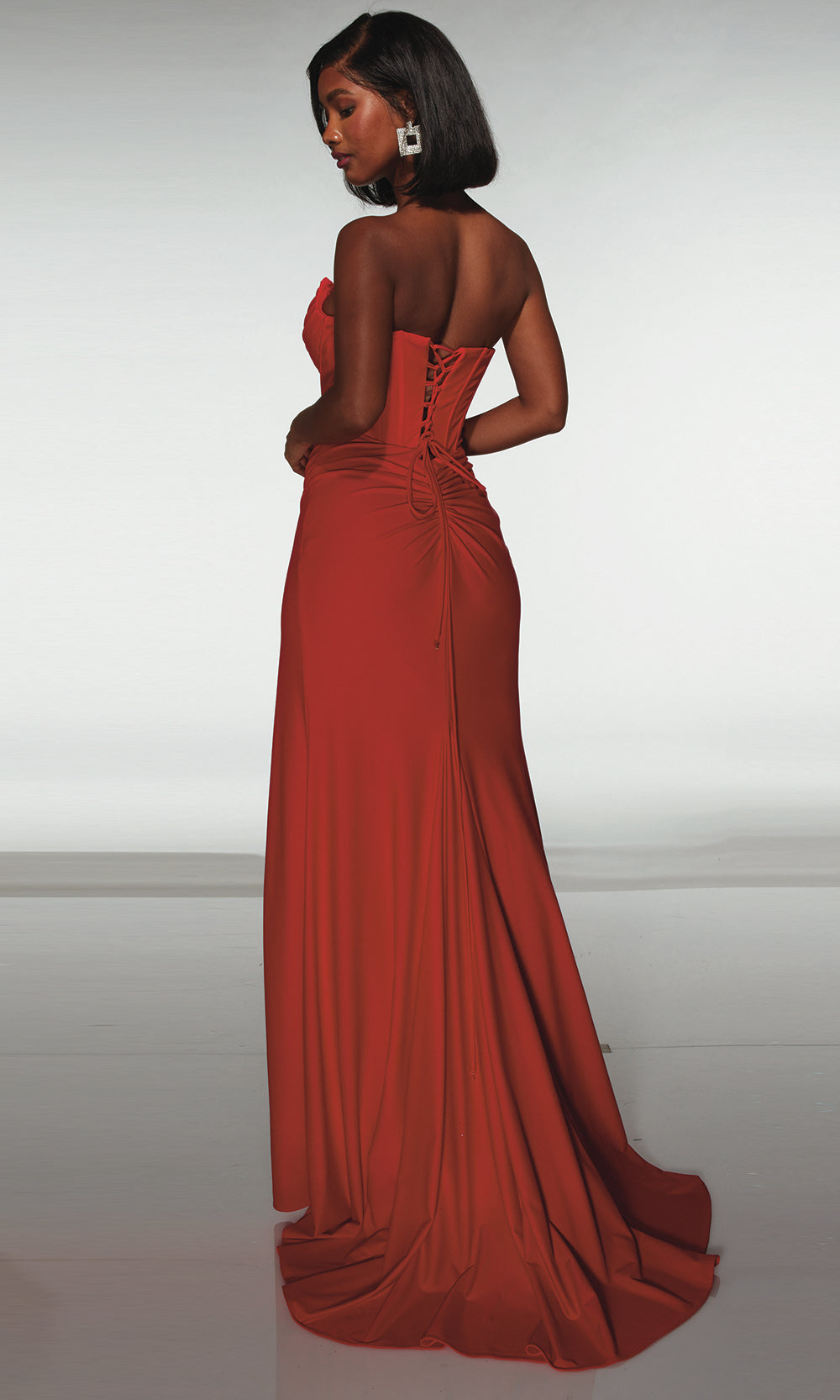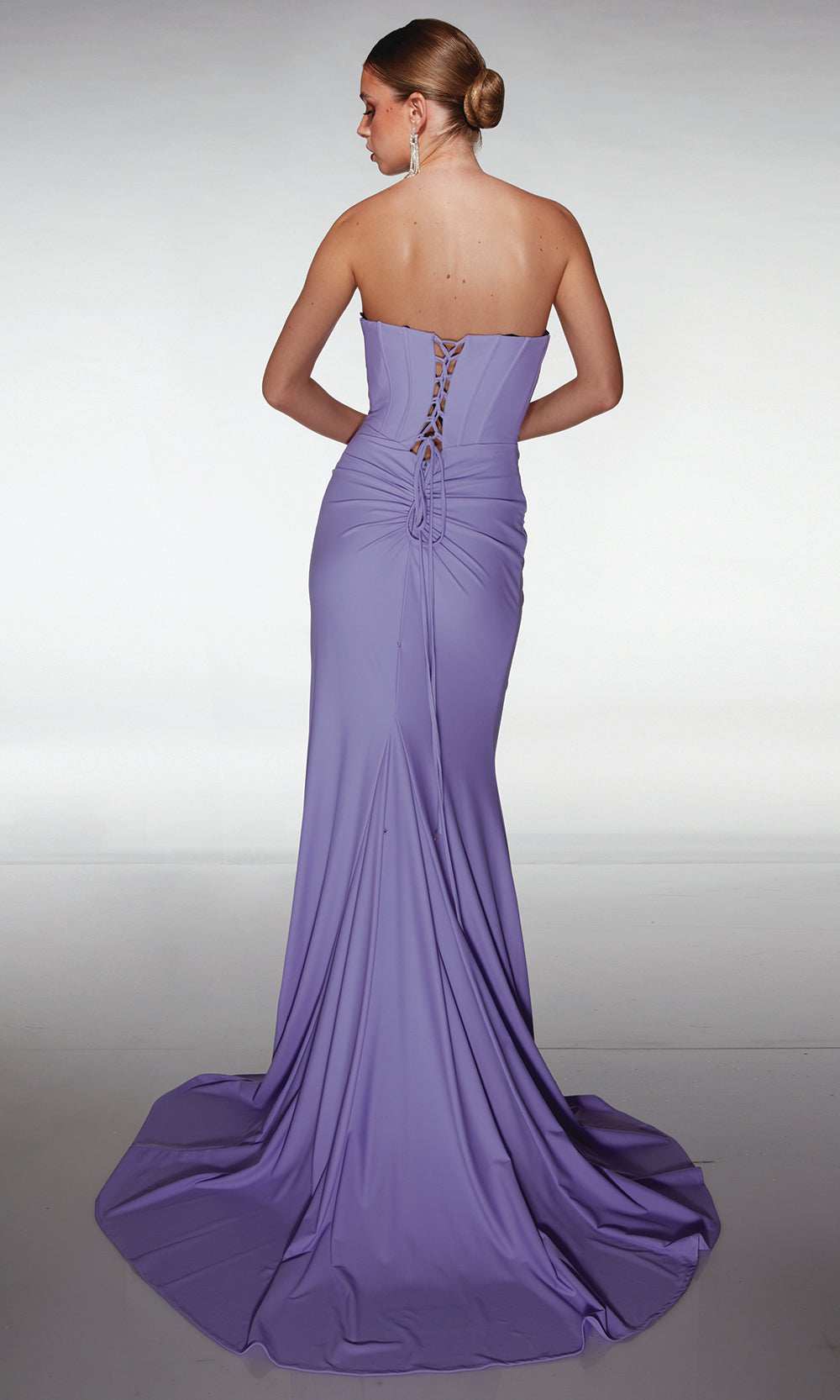 | Details: | Strapless corset bodice, Ruched waist drape, High thigh slit, Lace up back, Floor length skirt |