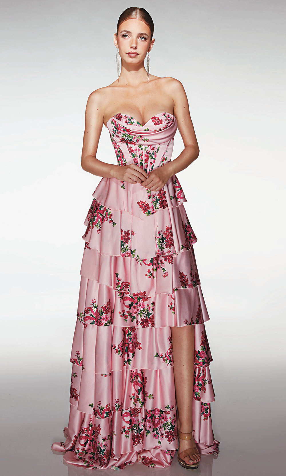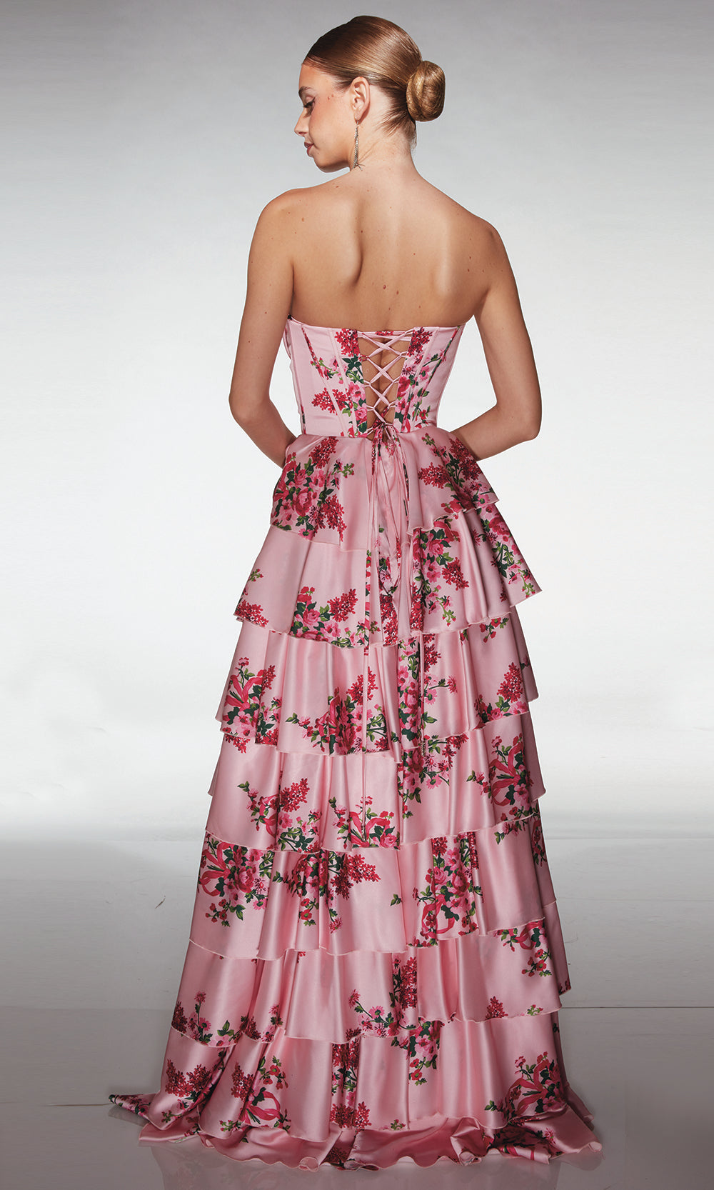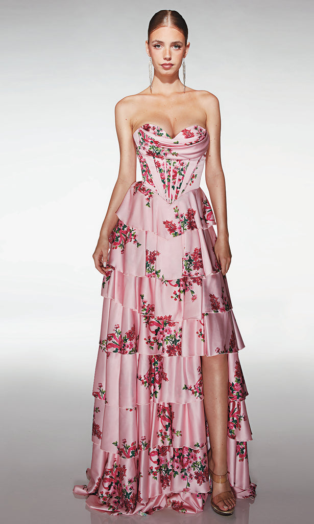 | Details: | Soft satin print fabric, Strapless sweetheart neckline, Corset-style bodice with visible boning, Tiered ruffle skirt in full ball-gown silhouette, Lace-up back detail. |