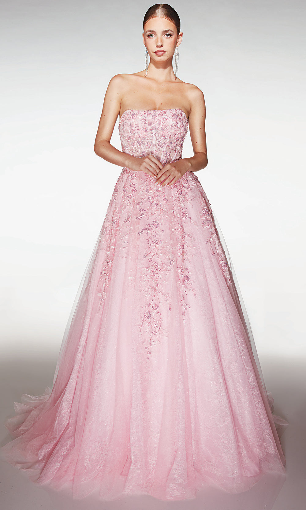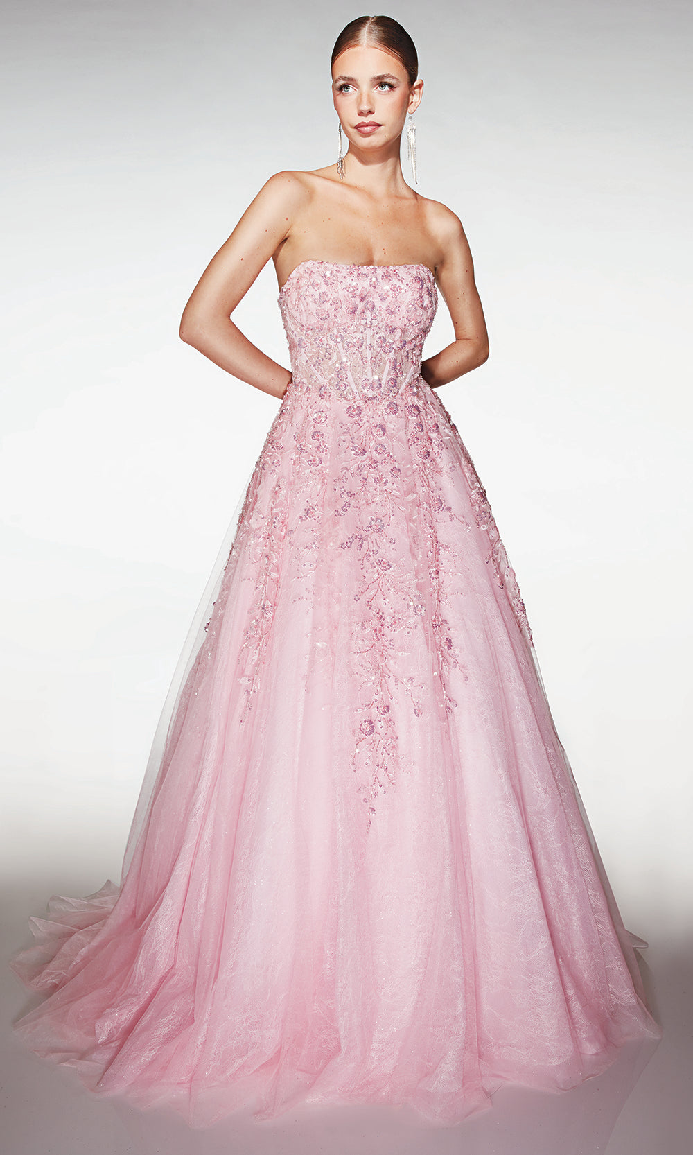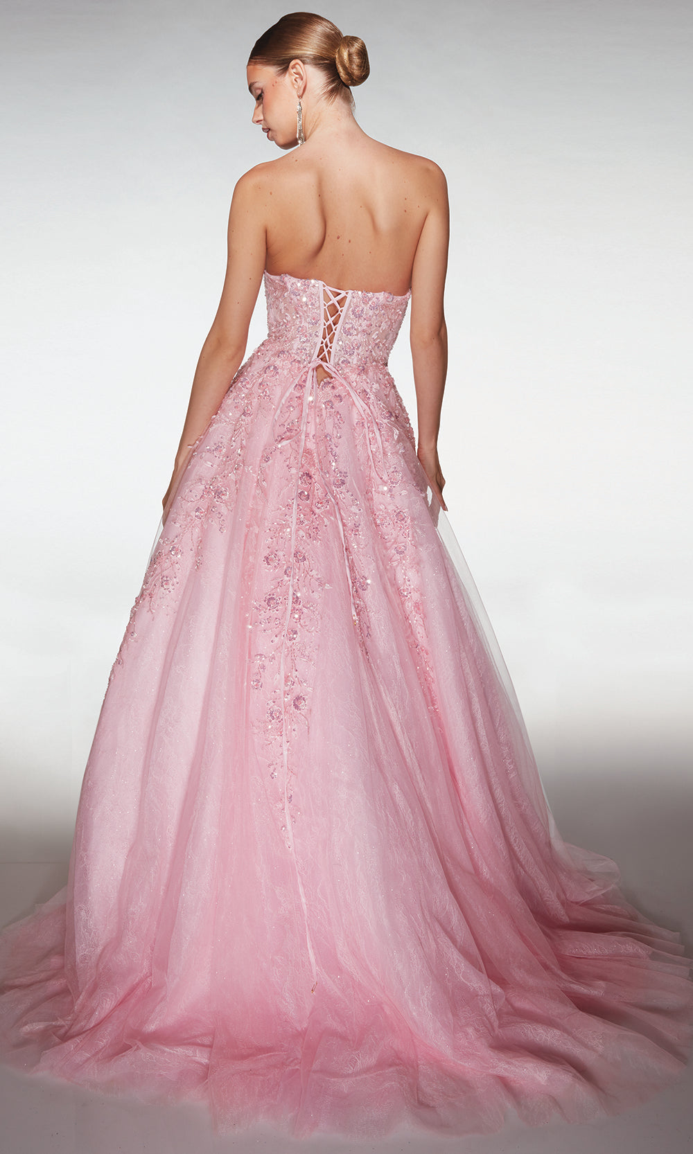 Aerie Couture 393 brings a fairytale presence to any event with its regal design and timeless charm. The strapless neckline pairs effortlessly with a structured corset bodice, creating a flattering shape enhanced by intricate floral applique that draws attention to every delicate detail. The full ball gown silhouette features layered tulle that adds dimension and movement, while the lace up back ensures a customizable fit. Choosing Aerie Couture 393 allows you to step into your celebration with elegance and grace, making it a beautiful choice for any unforgettable occasion. Model is wearing Pink color.