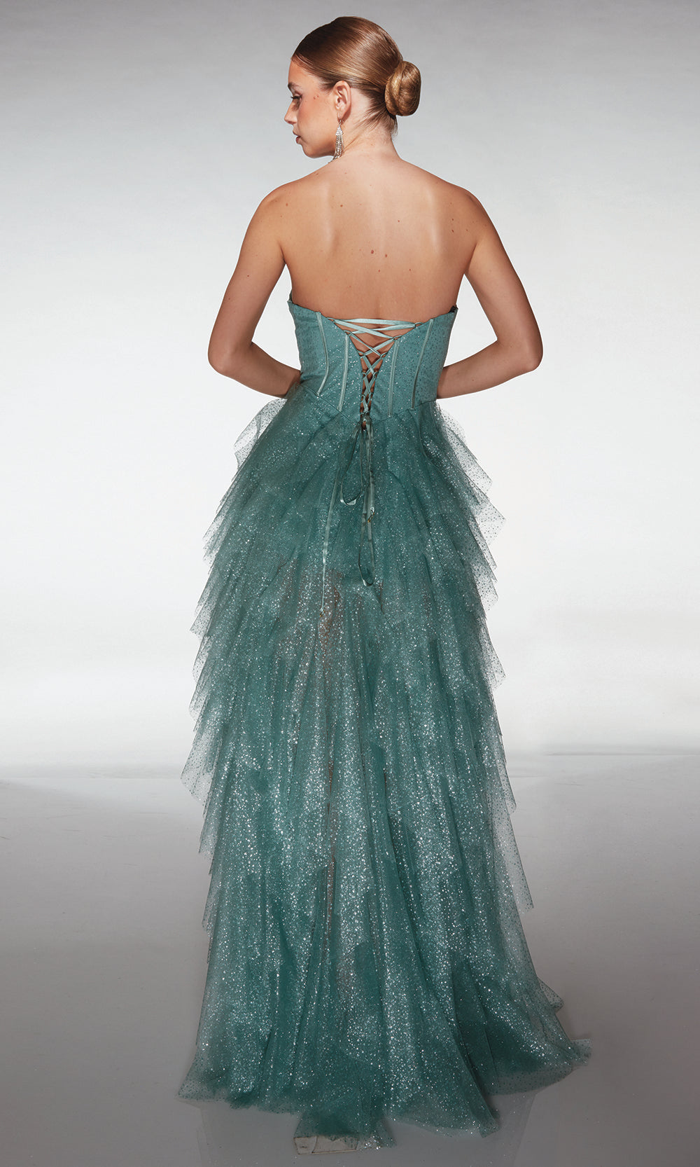 | Details: | Strapless neckline, Exposed boning bodice, Layered ruffle skirt, Lace up back, Sparkle tulle finish, Front slit |