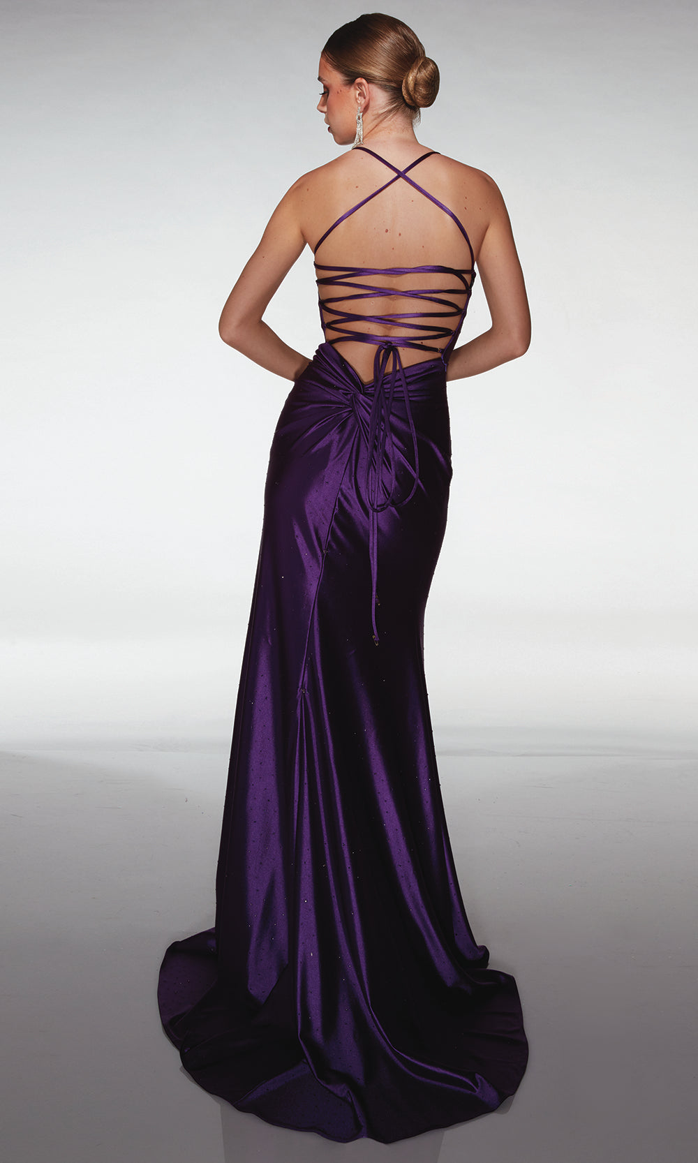 | Details: | Spaghetti straps, Square neckline, Fitted silhouette, High slit, Crisscross lace up back, Sweep train, Shimmer finish |
