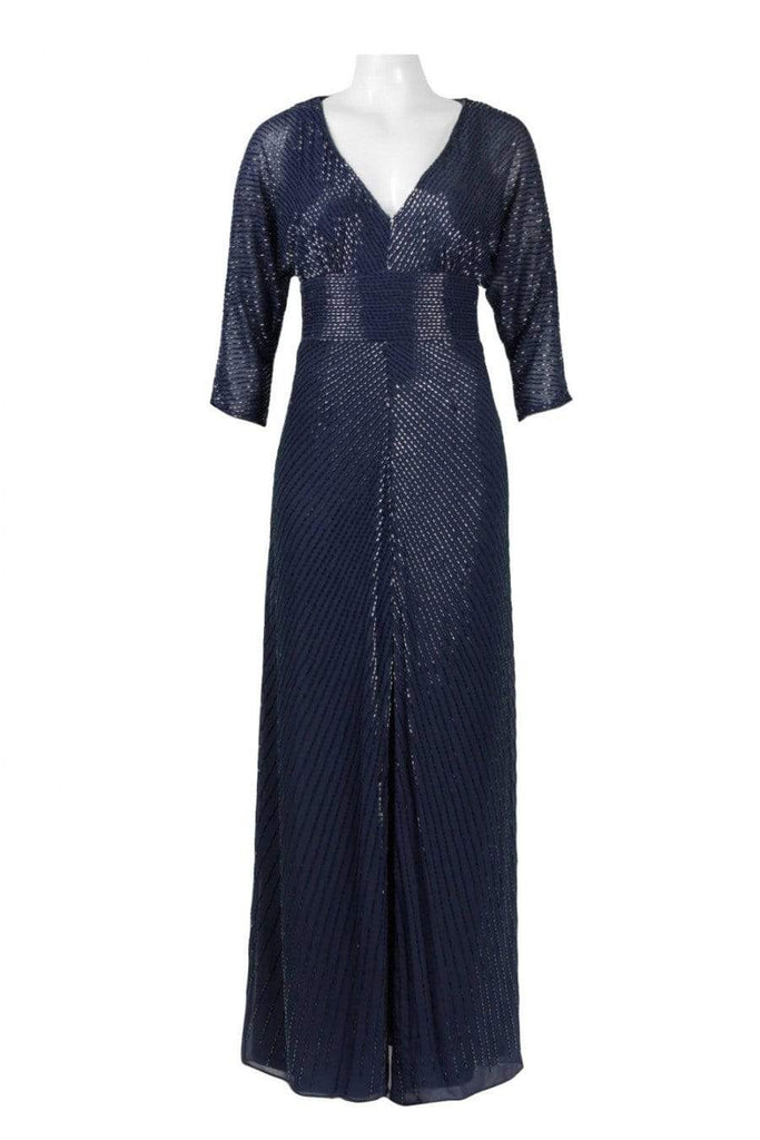 Show off your classy style when you wear this evening dress from Aidan Mattox 54473360. The beaded chiffon dress boasts a v-neckline, dolman sleeve, back keyhole, front slit and a sheath silhouette skirt. This Aidan Mattox ensemble is perfect for any formal evening. Dress on sale is available in Twilight color. Model represents the dress in Riviera color.