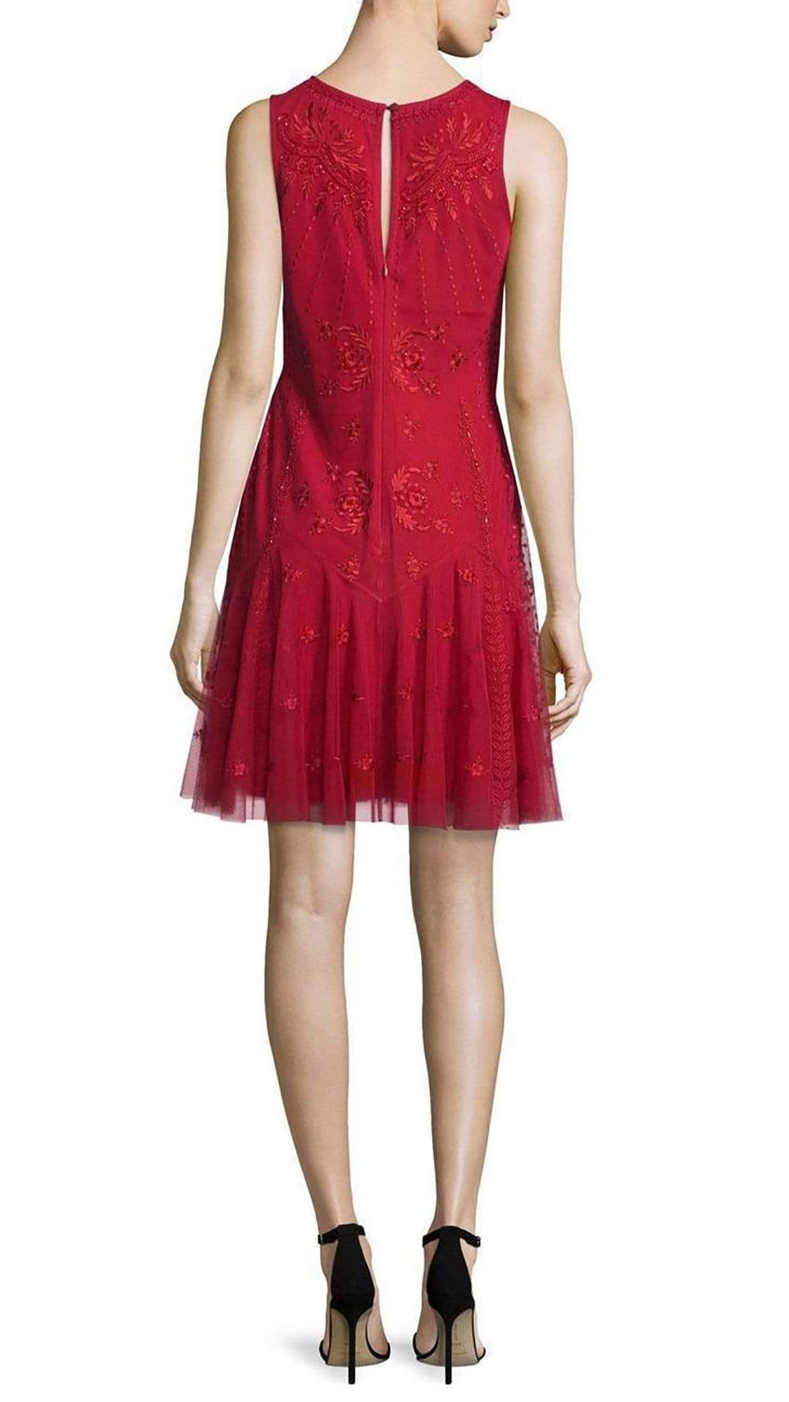 The embroidered mesh dress features a sleeveless, scoop neckline, a back keyhole and a trumpet silhouette skirt in mini hem.